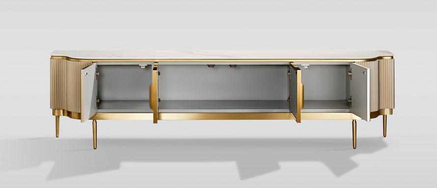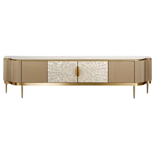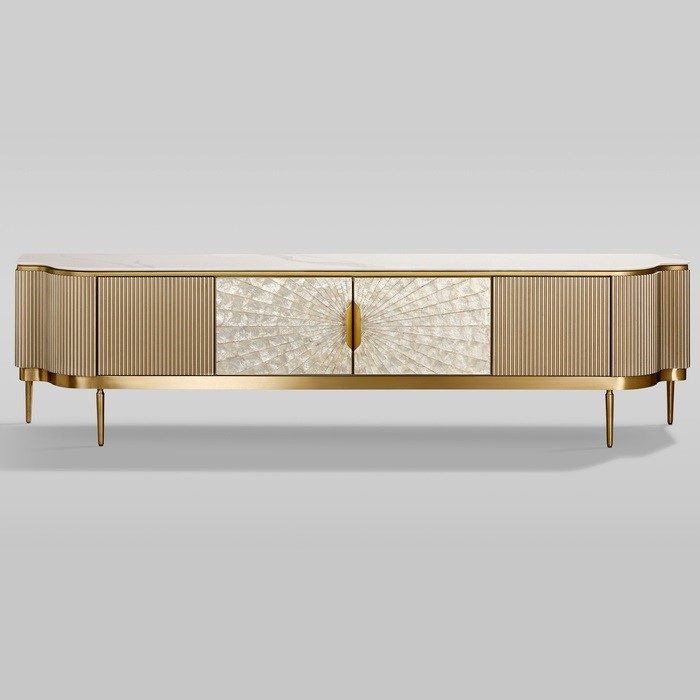 Komoda RTV Stilig ST905 to połączenie luksusu i nowoczesnego stylu. Wyjątkowy front z naturalnej muszli oraz marmurowy blat nadają meblowi elegancji, a ryflowane drewno dodaje struktury i głębi. Idealnie sprawdzi się w przestrzeniach, gdzie liczy się zarówno funkcjonalność, jak i wyrafinowany design.