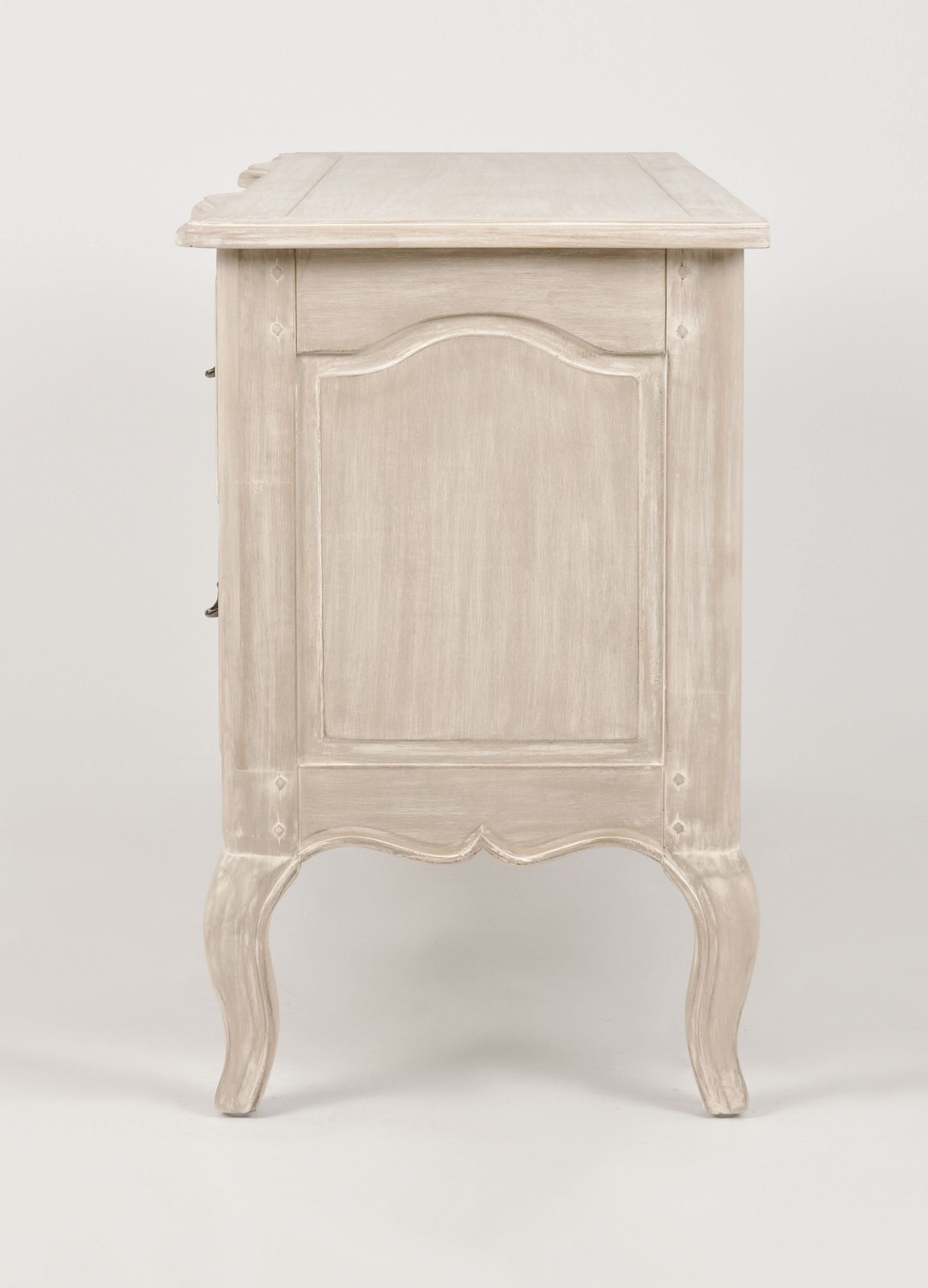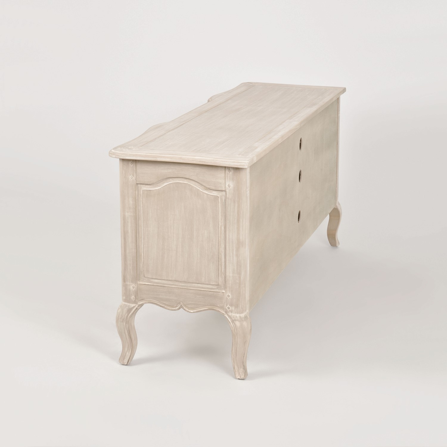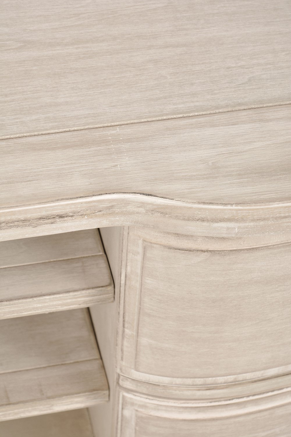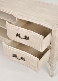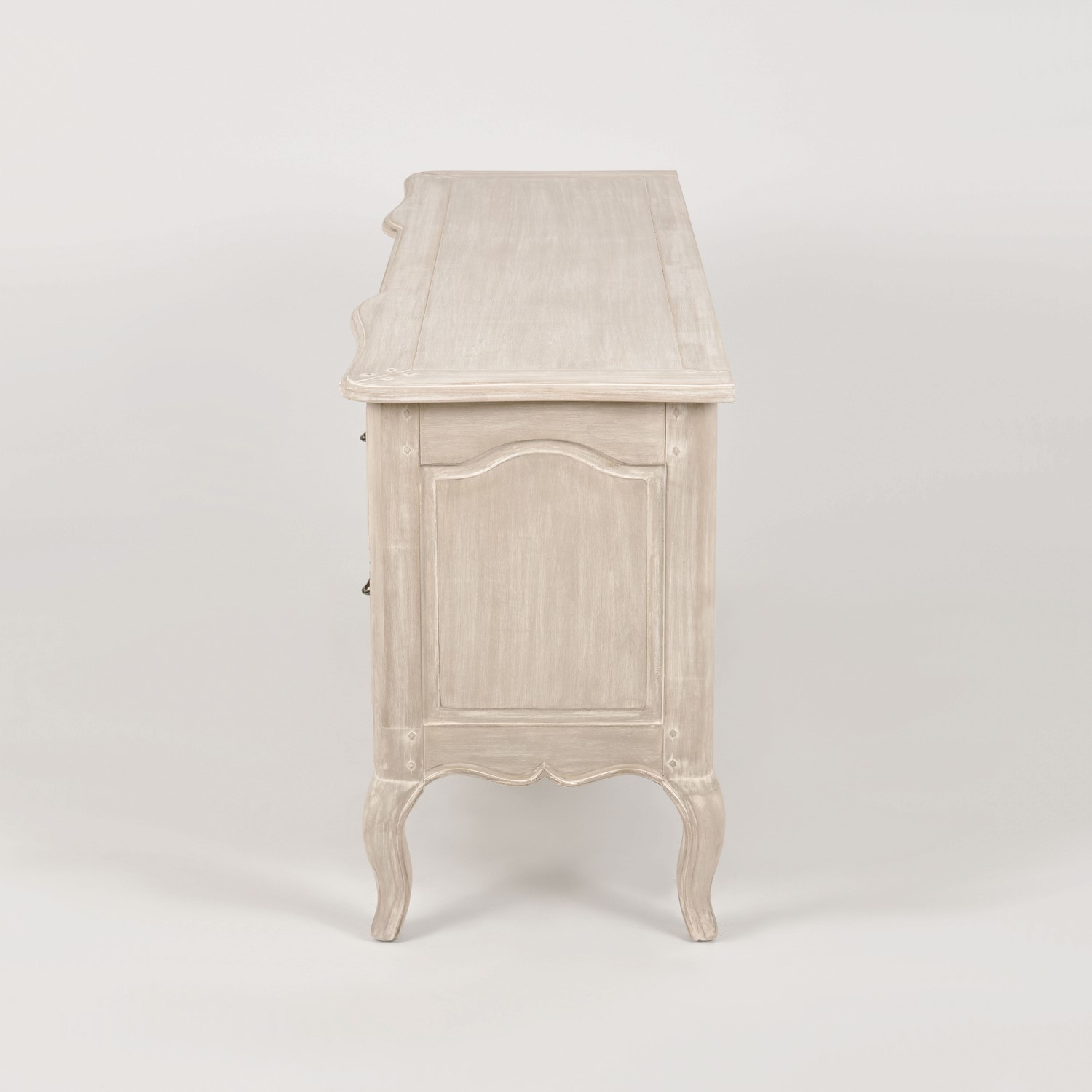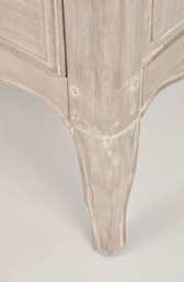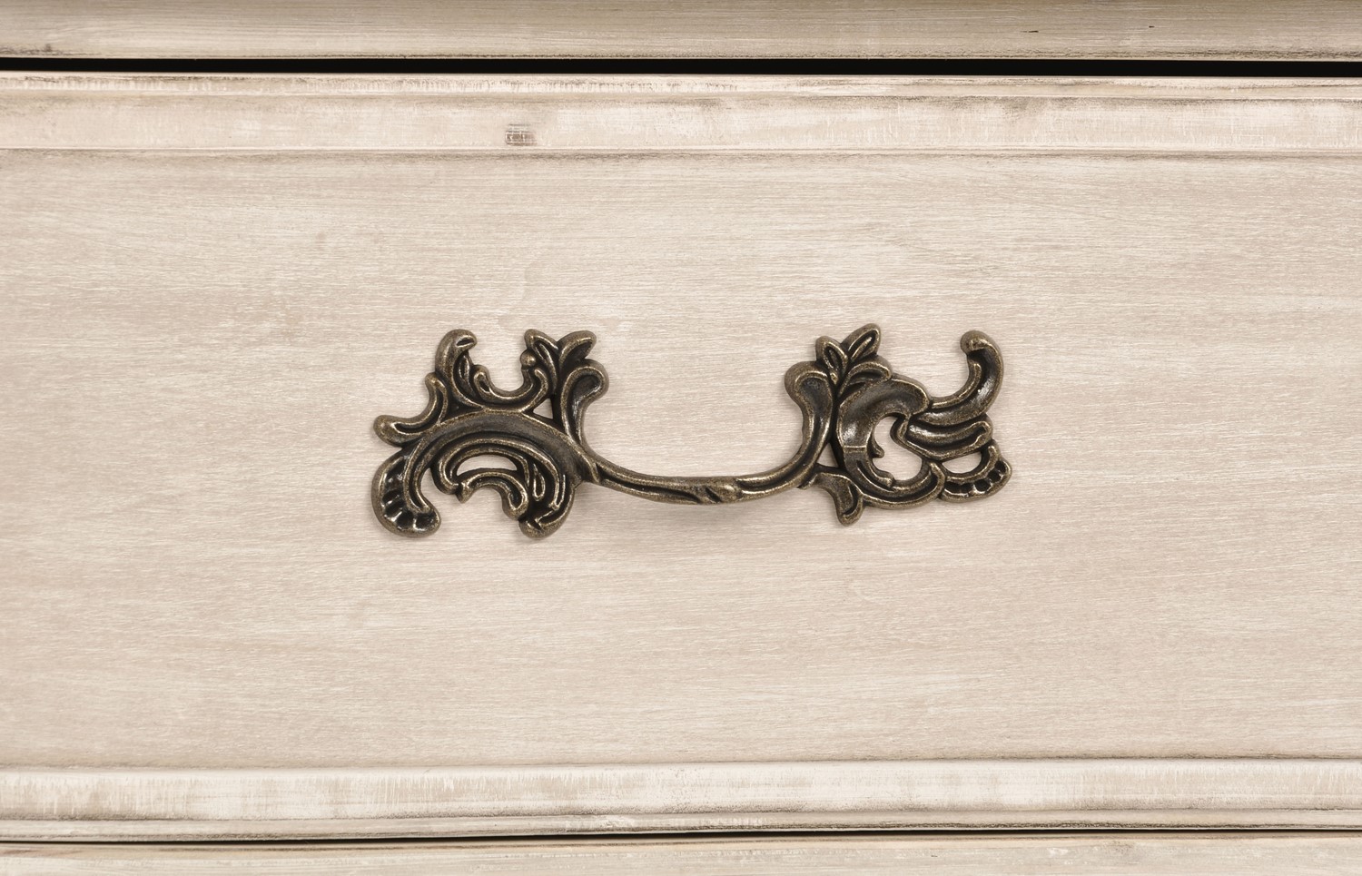 Elegancka komoda z litego drewna na giętych, frezowanych nogach, która zachwyca swym urokiem i stylowym wykończeniem. W pełni nawiązująca do stylu prowansalskiego, prezentuje się niezwykle wdzięcznie i wytwornie. Jej korpus w niejednolitym, półmatowym kolorze jasnego beżu nadaje wnętrzu subtelności i przytulności, tworząc harmonijną atmosferę. Zarówno korpus, jak i top, zdobione są charakterystycznym wzorem kornika, który dodaje meblowi rustykalnego uroku i naturalnego piękna. Dodatkowo, ozdobne ćwieki umieszczone na komodzie nadają jej wyjątkowego charakteru oraz elegancji, stanowiąc niezwykle subtelny, lecz znaczący element dekoracyjny.