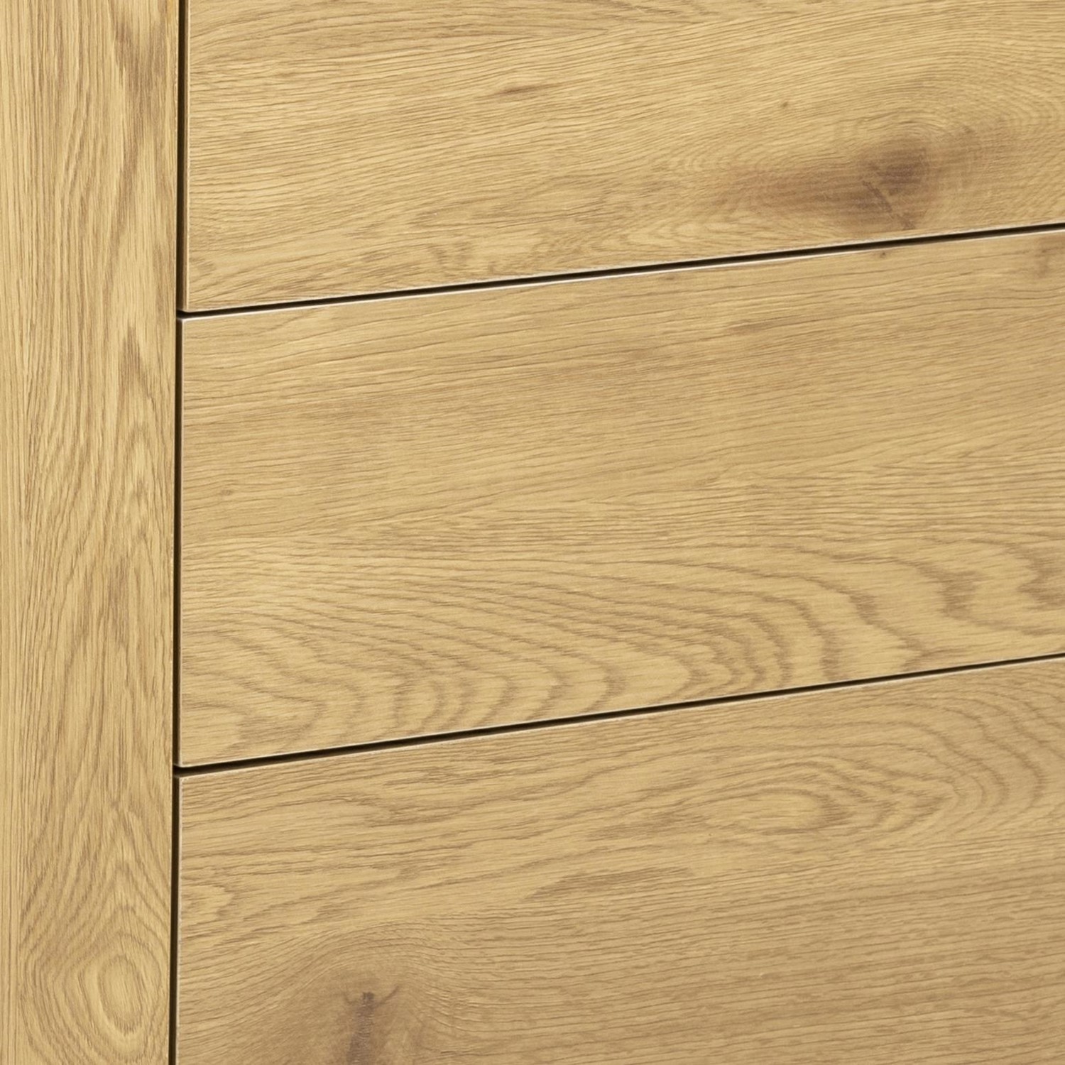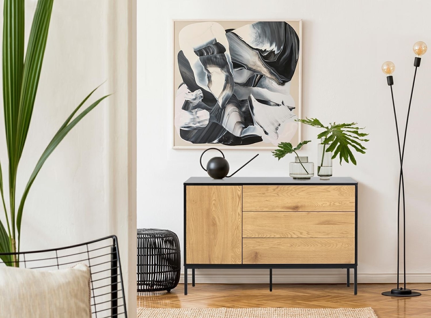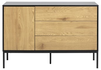 Komoda Seaford to mebel z industrialnej kolekcji Seaford. Składa się z trzech pojemnych szuflad oraz jednej szafki, a całość jest ustawiona na czterech czarnych matowych nogach. Fronty komody wykonane są z płyty MDF oklejonej okleiną imitującą naturalny dąb. To wspaniałe dopełnienie aranżacji przestronnego salonu. To idealny mebel do przechowywania ubrań, zastawy, pościeli czy obrusów. Jej kolor oraz minimalistyczny design sprawiają, że doskonale komponuje się w jadalni, sypialni lub salonie. Jeśli szukasz funkcjonalnego i nowoczesnego mebla to ta komoda to doskonały wybór.
