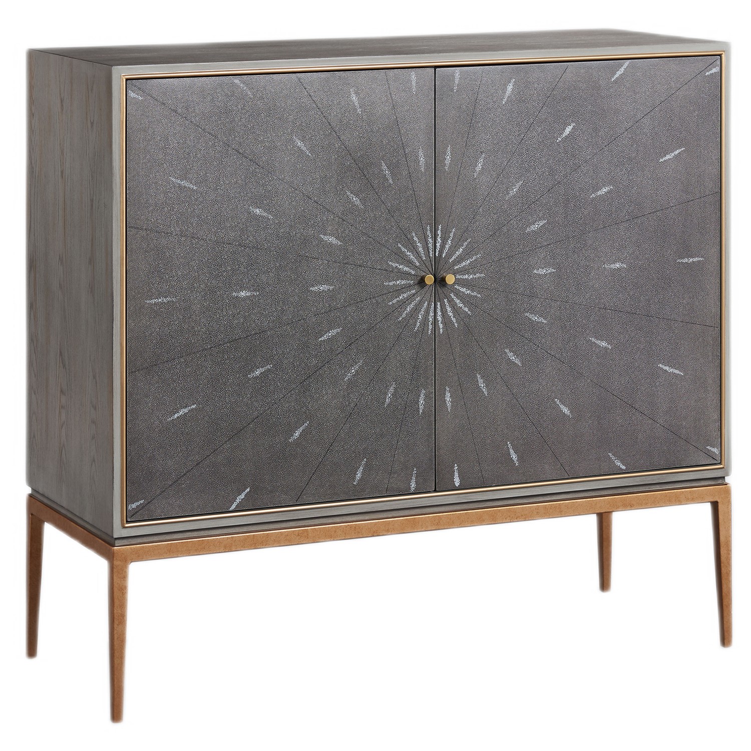 Oryginalna komoda w kolorze szarym z złotymi akcentami to wyjątkowy mebel, który dodaje elegancji i luksusu każdemu pomieszczeniu. Złote uchwyty, nogi oraz listwa ozdobna wokół drzwi nadają komodzie wyrafinowanego wyglądu, podkreślając jej unikalność. Korpus komody pokryty okleiną z widoczną strukturą drewna dodaje jej naturalnego uroku i charakteru. Drzwi, pokryte ekoskołą rekina (shagreen) ze wzorem, stanowią efektowny element dekoracyjny, który przyciąga uwagę swoją oryginalnością.