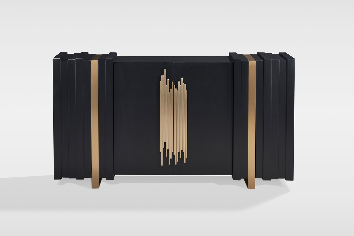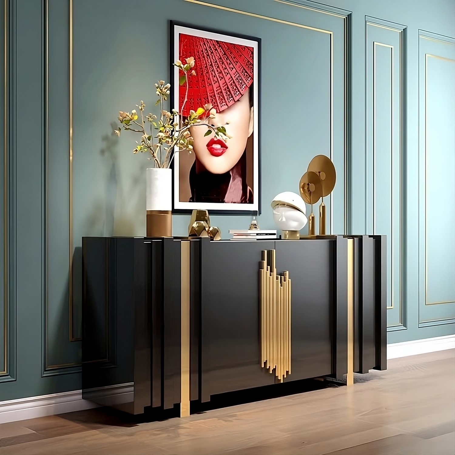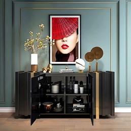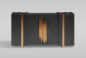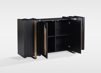 Oryginalna komoda w czarnym kolorze ze złotymi akcentami to wyjątkowy mebel, który dodaje charakteru i elegancji każdemu pomieszczeniu. Złote ozdobne uchwyty i nogi komody stanowią wyrafinowane detale, które nadają jej luksusowego wyglądu. Prosty design komody został przełamany wykończeniem 3D, które idealnie współgra z kształtem nóg i uchwytów, tworząc spójną i harmonijną całość. To połączenie dodaje komodzie wyjątkowego charakteru i stylu.