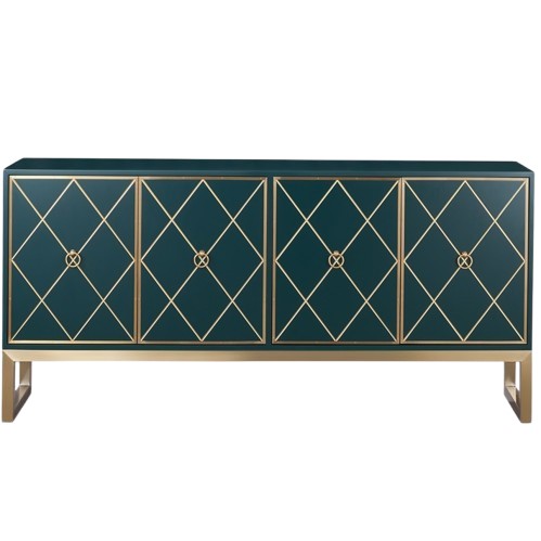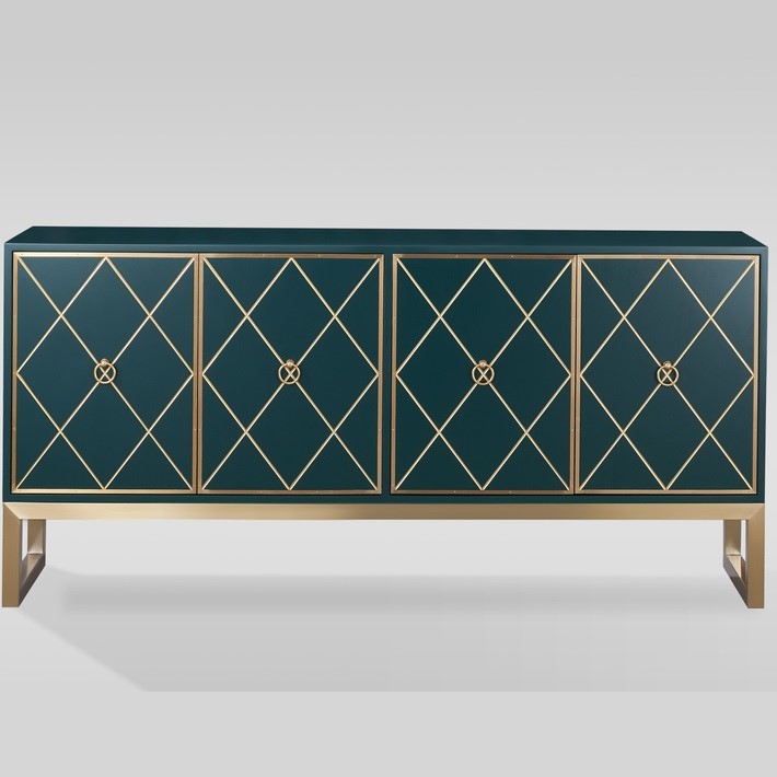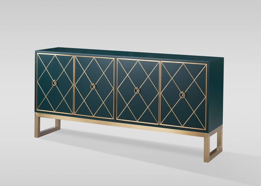 Komoda Stilig ST09 w kolorze butelkowej zieleni to elegancki mebel o wyjątkowym charakterze. Zdobiona rombami i złotymi listwami, stanowi luksusowy element każdego wnętrza. System soft close oraz regulowane półki zapewniają wygodę użytkowania, dzięki czemu komoda jest zarówno praktyczna, jak i dekoracyjna.