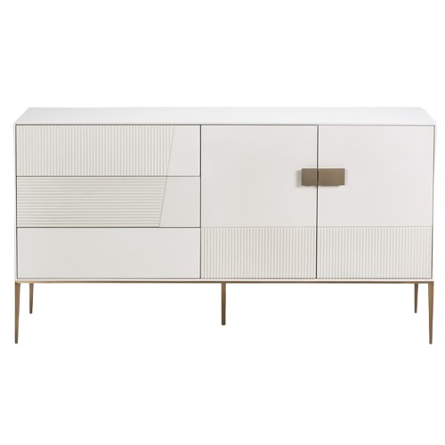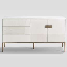Stilig ST102A to komoda o eleganckiej, prostej formie z wykończeniem w złamanej bieli i złotymi akcentami. Dzięki szufladom i półkom zapewnia dużą przestrzeń do przechowywania. Jest doskonałym wyborem dla osób, które cenią funkcjonalność połączoną z estetyką.