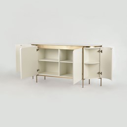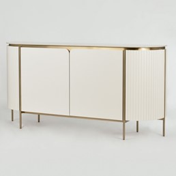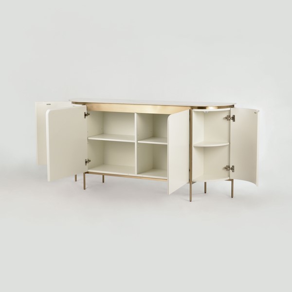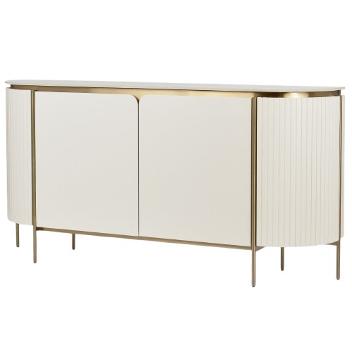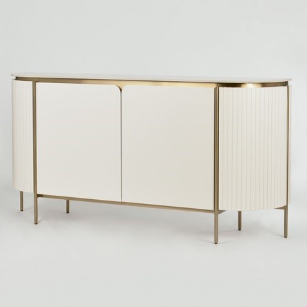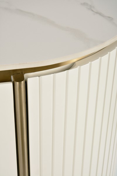 Komoda ST121 od Stilig łączy w sobie subtelną elegancję złamanej bieli z luksusowym wykończeniem złotymi detalami i marmurowym blatem. Zaokrąglone boki zdobione ryflowanym drewnem dodają jej szyku i elegancji, a przemyślane detale tworzą harmonijny, przyjemny dla oka projekt. Dzięki swojej funkcjonalności i estetyce, idealnie sprawdzi się w stylowych, nowoczesnych aranżacjach.