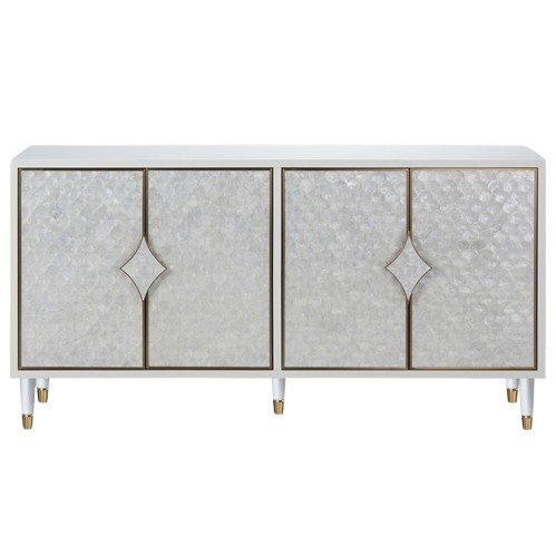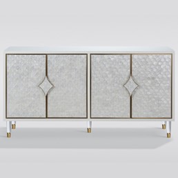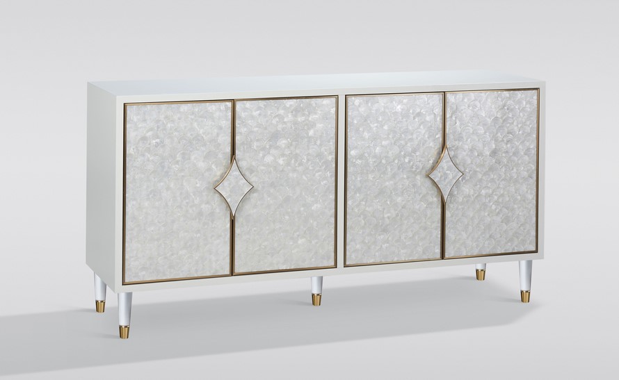 Komoda Stilig ST200 to wyjątkowy mebel łączący elegancję z funkcjonalnością. Biały ecru korpus ozdobiony frontem z naturalnej muszli i złotymi listwami nadaje jej luksusowy charakter. Dzięki systemowi soft close i regulowanym półkom jest to zarówno praktyczne, jak i stylowe rozwiązanie do salonu lub sypialni.
