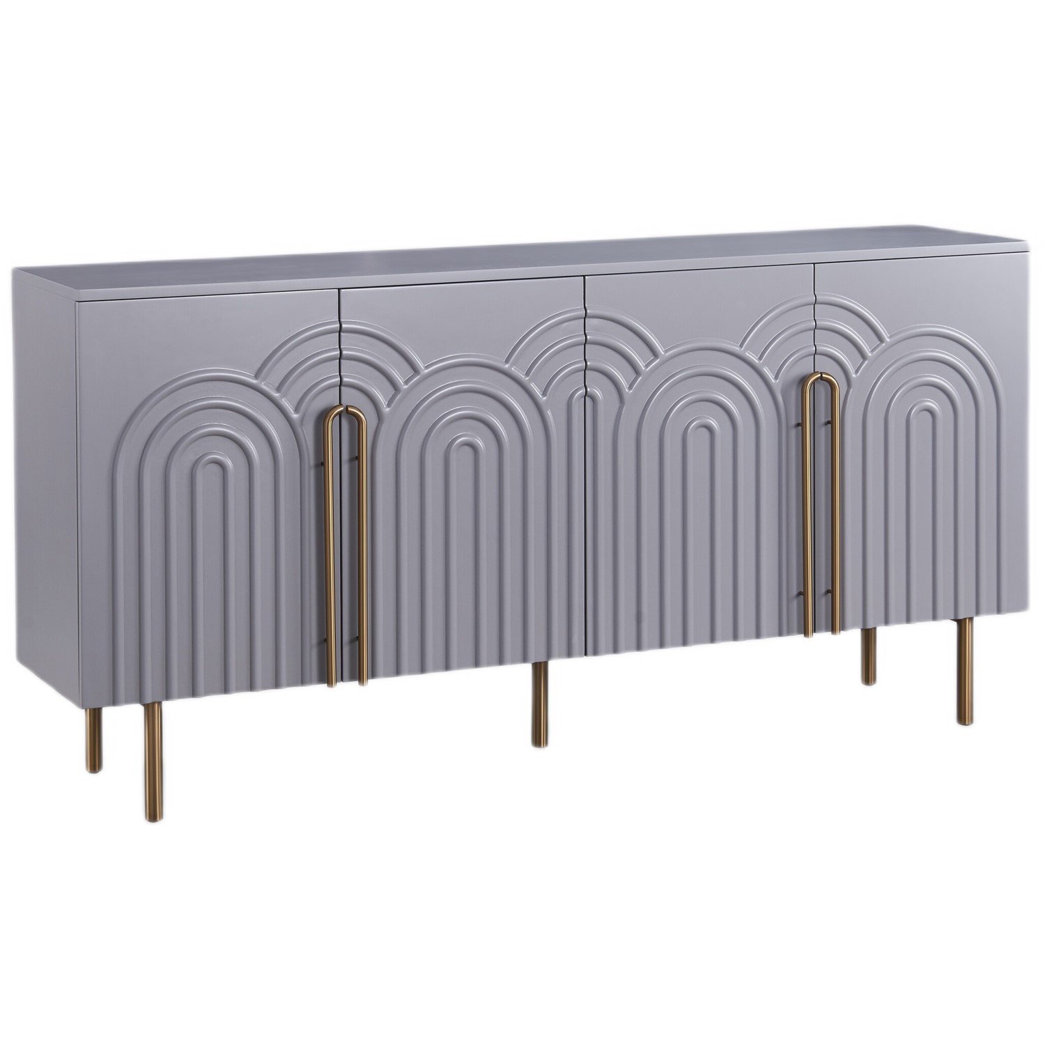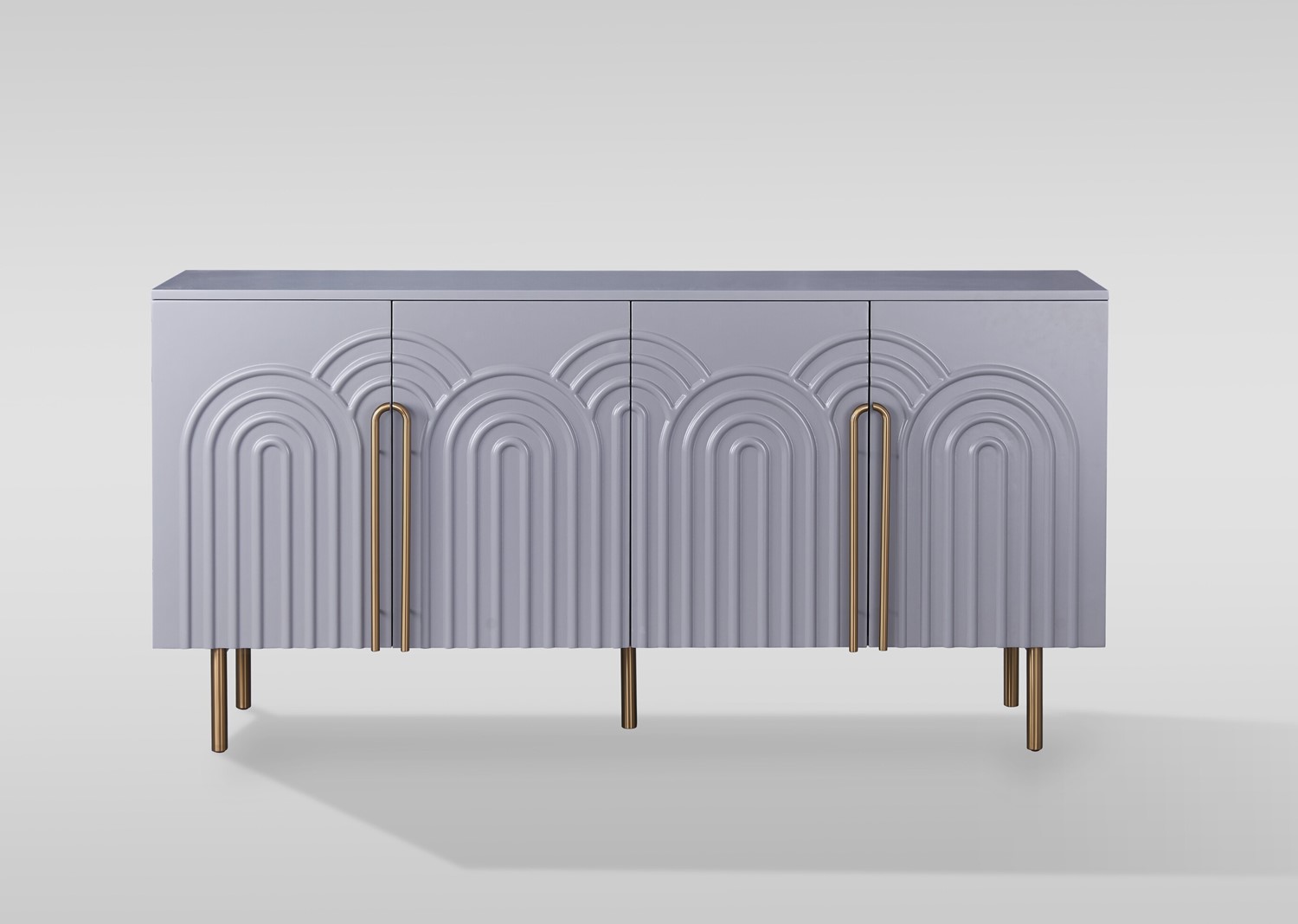 Oryginalna komoda w kolorze jasnoszarym ze złotymi akcentami to elegancki i stylowy mebel, który dodaje charakteru każdemu pomieszczeniu. Jej fronty drzwi posiadają wytłoczony wzór łuków, który idealnie współgra z uchwytami w tym samym kształcie, co nadaje komodzie unikalnego wyglądu. Złote akcenty w postaci uchwytów i nóg dodają komodzie luksusowego wyglądu i elegancji. Kolor jasnoszary nadaje meblowi subtelnego uroku i pasuje do różnych stylów aranżacyjnych, tworząc harmonijne połączenie z pozostałymi elementami wnętrza. Ta komoda nie tylko jest praktycznym meblem do przechowywania, ale także stanowi wyrafinowany element dekoracyjny, który nadaje wnętrzu indywidualnego charakteru. Niech stanie się ona centralnym punktem Twojej przestrzeni, dodając jej elegancji i stylu.