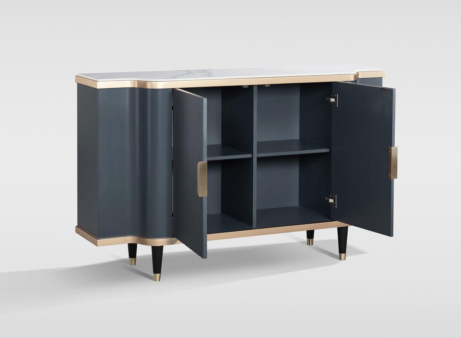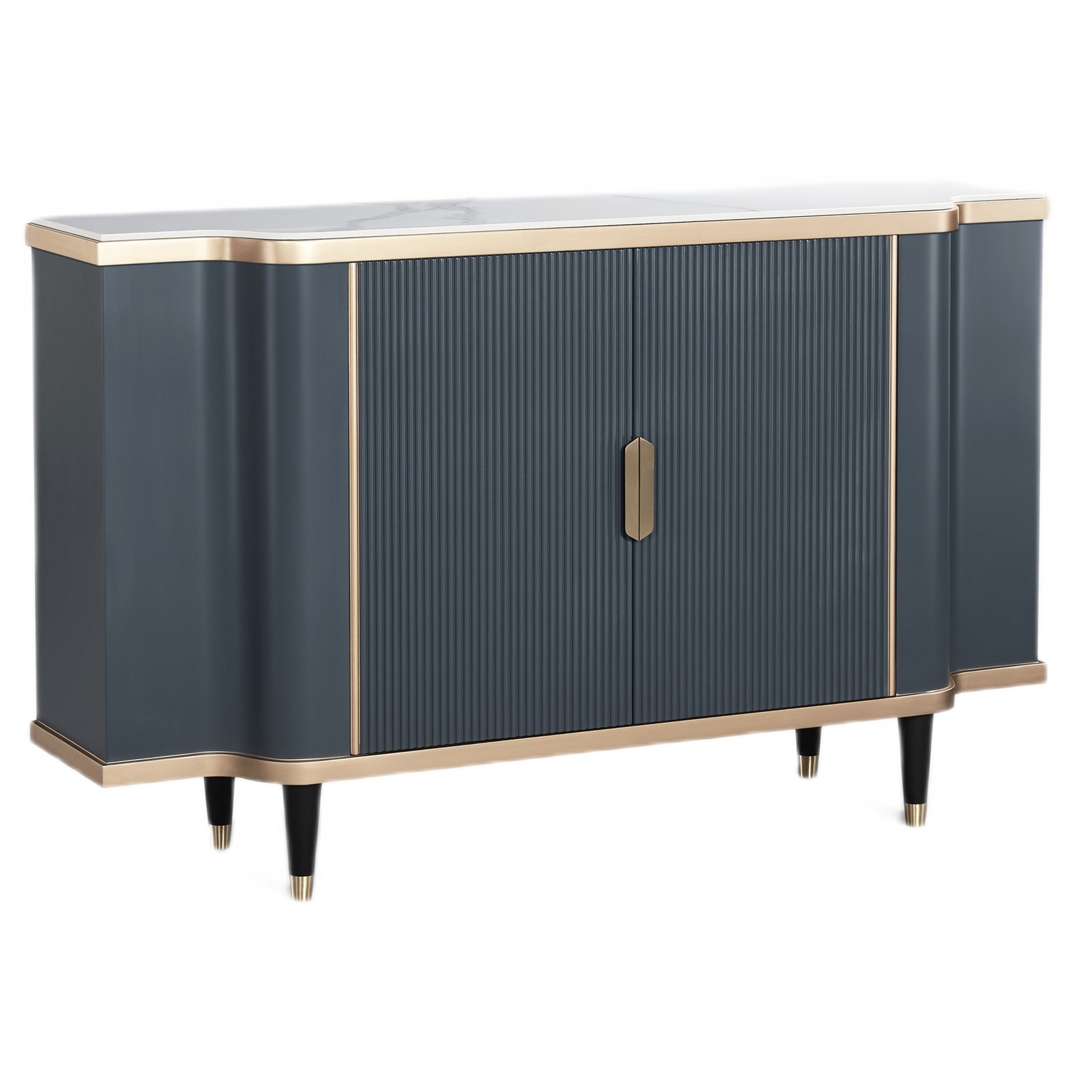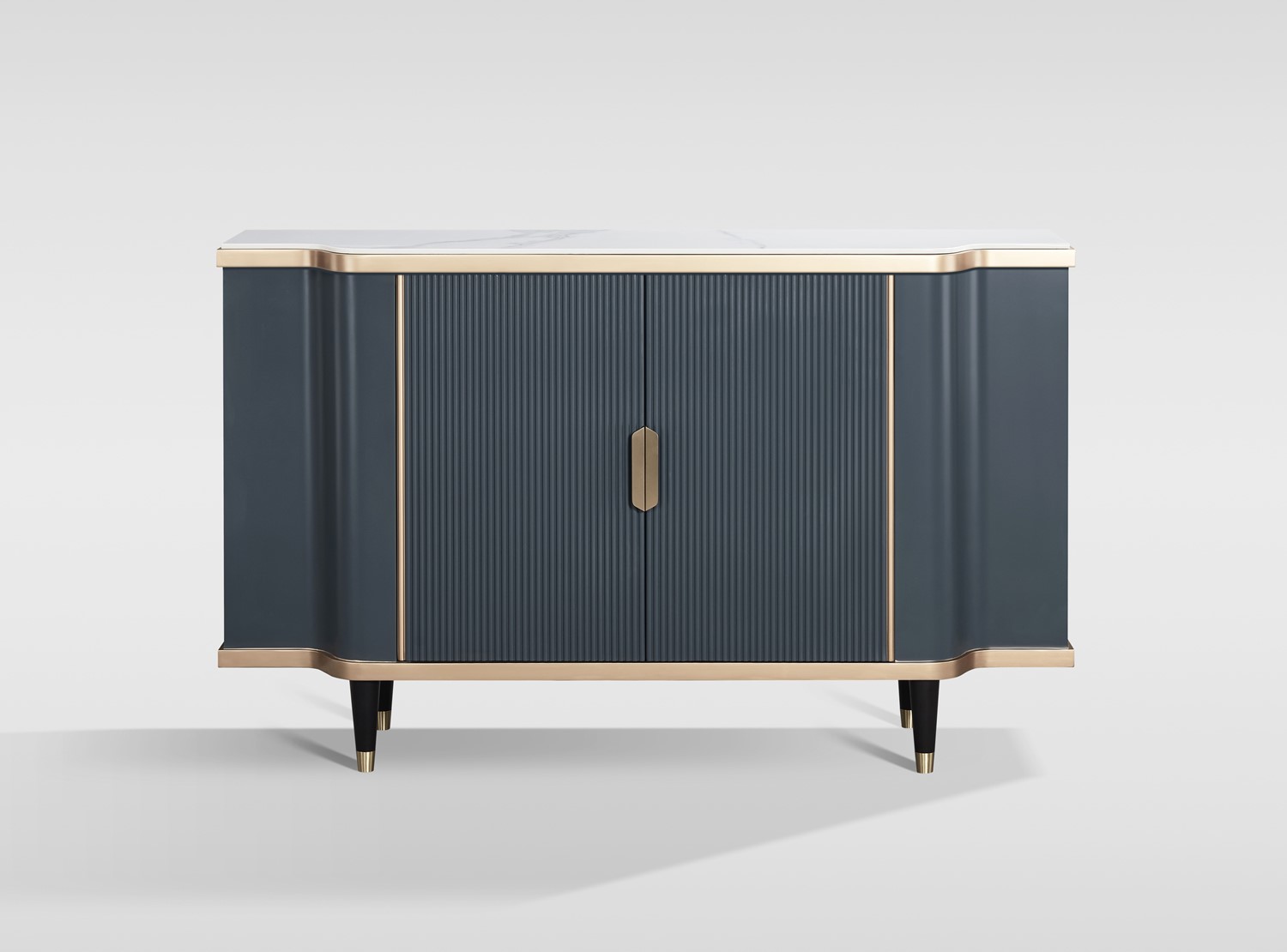 Stylowa komoda w kolorze grafitowym ze złotymi akcentami to elegancki i wyjątkowy mebel, który dodaje charakteru i luksusowego wyglądu każdemu pomieszczeniu. Ryflowane drewno na korpusie komody nadaje jej tekstury i wyjątkowego charakteru. Blat komody wykonany w wykończeniu marmurowym dodaje jej wysokiej jakości wyglądu i dodatkowego prestiżu. Złote akcenty, takie jak uchwyty i detale na nogach, dodają elegancji i stylu, podkreślając luksusowy charakter mebla. Ta komoda nie tylko jest praktycznym meblem do przechowywania, ale także jest wyrafinowanym elementem dekoracyjnym, który wzbogaca wystrój wnętrza. Niech stanie się ona centralnym punktem Twojej przestrzeni, dodając jej elegancji i stylu.