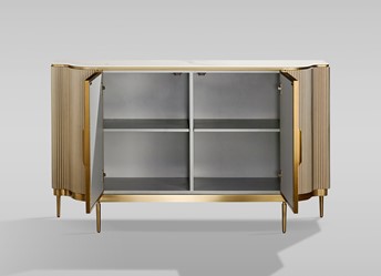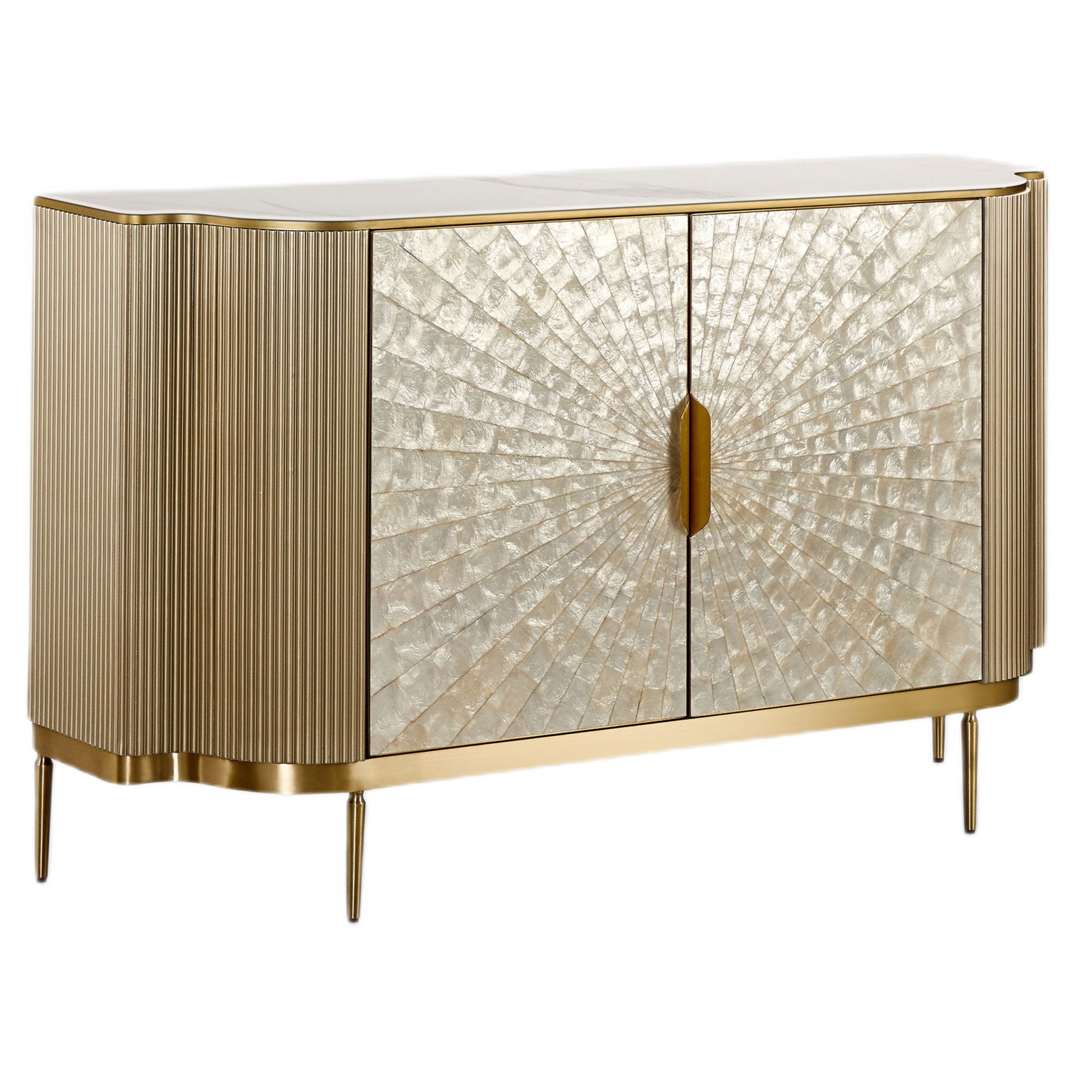 Oryginalna komoda w kolorze szampańskiego złota to wyjątkowy mebel, który emanuje luksusem i wyrafinowaniem. Front komody wykonany z naturalnej muszli, układającej się w symetryczny wzór, dodaje jej ekskluzywnego charakteru i wyjątkowego uroku. Korpus komody z ryflowanym drewnem oraz blat z wykończeniem marmurowym tworzą harmonijne połączenie, podkreślając elegancję i prestiż mebla. Kolor szampańskiego złota nadaje komodzie luksusowego wyglądu, który doskonale komponuje się z naturalnymi materiałami używanymi do wykonania frontu i blatu. Ta komoda nie tylko jest funkcjonalnym meblem do przechowywania, ale także stanowi wyrafinowany element dekoracyjny, który nadaje wnętrzu wyjątkowego charakteru i stylu. Niech stanie się ona centralnym punktem Twojej przestrzeni, dodając jej elegancji i prestiżu.