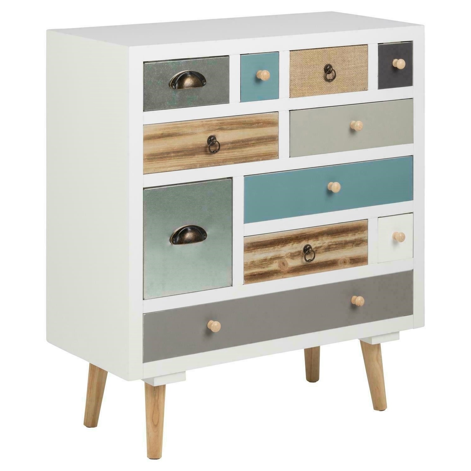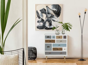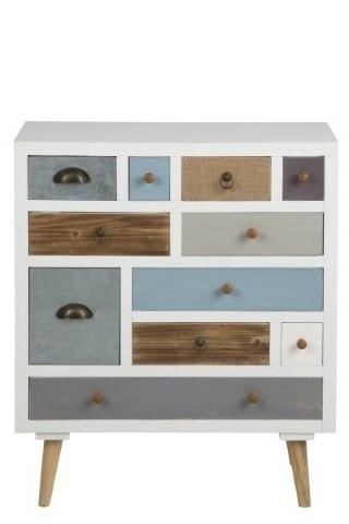 Komoda Thais to mebel o wyjątkowym designie, który łączy styl retro z funkcjonalnością. Komoda Thais ma prosty, ale elegancki wygląd, który nawiązuje do mebli z ubiegłych dekad. Jej asymetryczne układy szuflad i różne kształty uchwytów dodają uroku. Na frontach komody widoczne są różne kolory i faktury, co tworzy niepowtarzalną atmosferę. Miraż błyszczącego i matowego wykończenia szuflad dodaje głębi i charakteru. Szuflady o różnych rozmiarach zapewnia dużo miejsca do przechowywania ubrań, książek i innych przedmiotów. Metalowe uchwyty ułatwiają korzystanie z szuflad. Komoda wykonana jest z wysokiej jakości materiałów, takich jak płyta MDF i sosnowe nóżki. To gwarantuje, że mebel będzie służył przez długie lata. Jeśli szukasz mebla, który połączy styl z praktycznością, komoda Thais może być doskonałym wyborem.