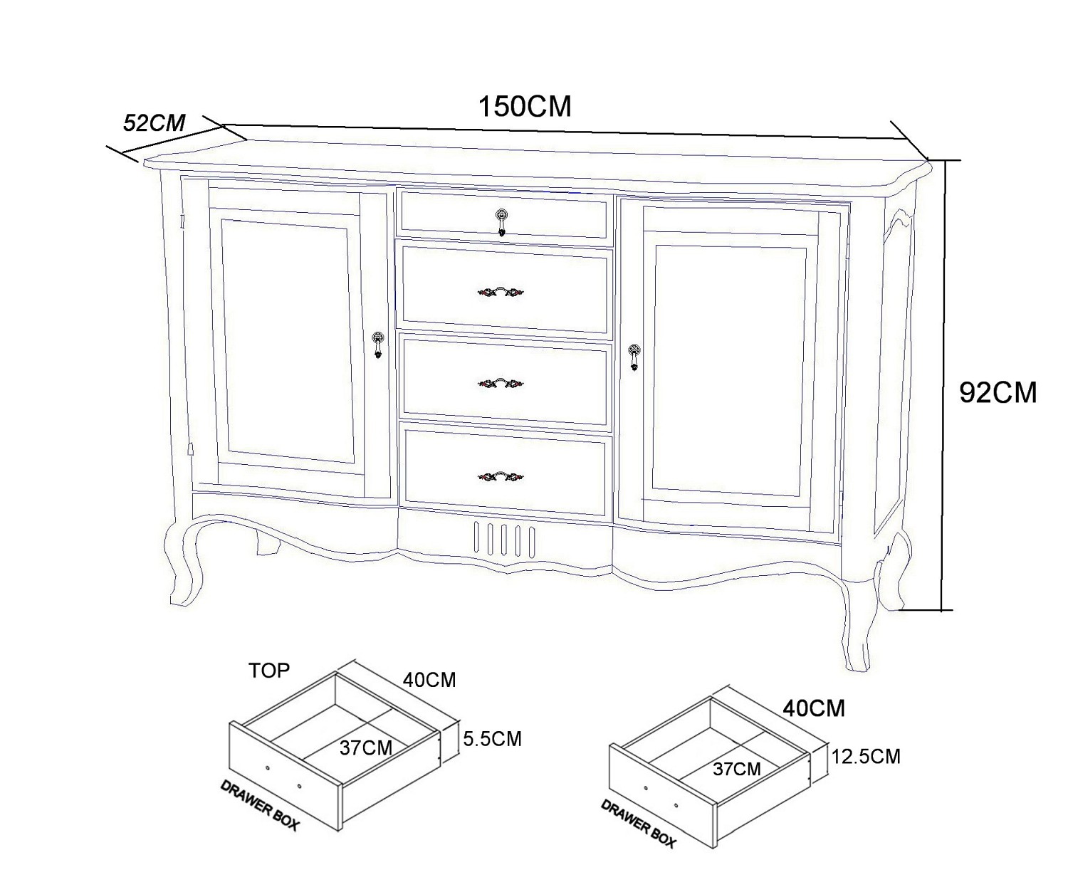 Elegancka w pełni drewniana komoda na giętych, frezowanych nogach jest w stylu prowansalskim. Korpus jest w niejednolitym kolorze jasnobeżowym w półmacie. Korpus i blat posiadają charakterystyczne kornikowanie oraz ozdobne ćwieki. Komoda posiada ozdobne, metalowe uchwyty w kolorze ciemnego mosiądzu oraz frezowania. Produkt posiada cztery szuflady na drewnianych prowadnikach oraz dwoje itwieranych drzwi.