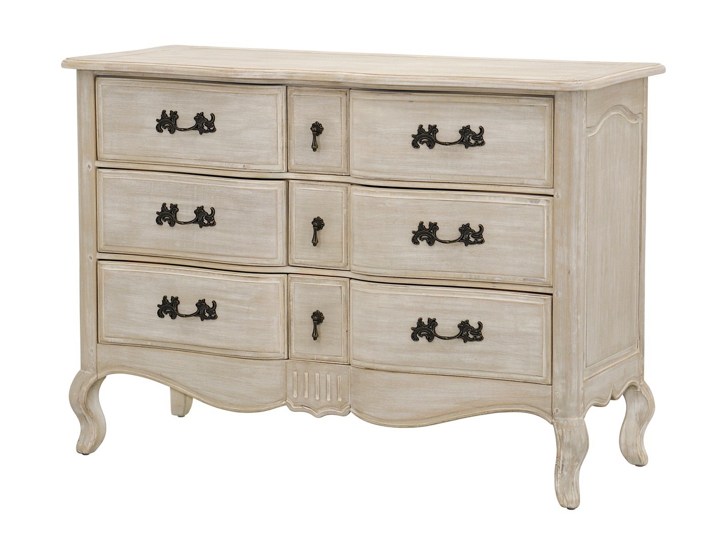 Elegancka w pełni drewniana komoda na giętych, frezowanych nogach jest w stylu prowansalskim. Korpus jest w niejednolitym kolorze jasnobeżowym w półmacie. Korpus i blat posiadają charakterystyczne kornikowanie oraz ozdobne ćwieki. Komoda posiada ozdobne, metalowe uchwyty w kolorze ciemnego mosiądzu oraz frezowania. Produkt posiada dziewięć szuflad na drewnianych prowadnikach.