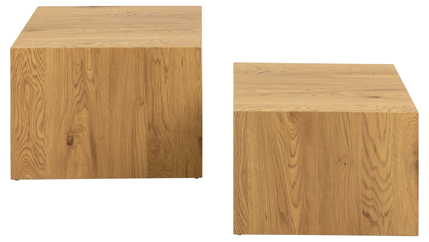 Komplet składa się z trzech stolików kawowych o różnych rozmiarach, wykonanych z solidnego dębowego drewna. Stoliki mają kształt kostki, co nadaje im nowoczesny i stylowy wygląd. Można je stosować zarówno jako osobne stoliki, jak i łączyć w różne konfiguracje, tworząc interesujące kompozycje. Idealnie sprawdzą się w salonie czy pokoju dziennym, dodając elegancji i funkcjonalności przestrzeni.Stoliki wykonane są z wysokiej jakości materiałów, co gwarantuje trwałość i solidność konstrukcji. Komplet stolików kawowych wykonanych z dębu to idealne rozwiązanie do eleganckiego i stylowego wystroju salonu..