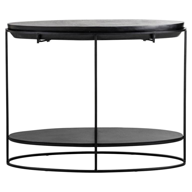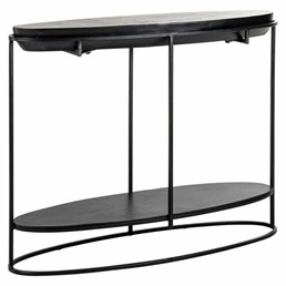 Prostokątny blat wraz z minimalistyczną podstawą został wykończony w szykownym czarnym kolorze z aluminium.