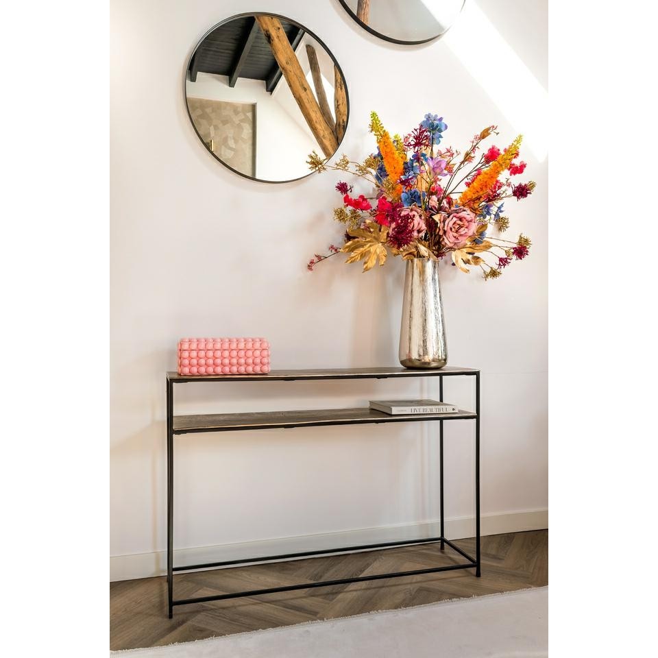 RICHMOND prezentuje praktyczną konsolę CHANDON marki Richmond Interiors, idealną do mniejszych pomieszczeń, takich jak przedpokój, salon czy sypialnia. To nie tylko funkcjonalny mebel, ale również elegancki akcent, który doskonale uzupełni różne wnętrza. Blaty konsoli wykonane są z odlewanego aluminium w urokliwym odcieniu szampańskiego złota, nadając pomieszczeniu subtelny blask. Solidna podstawa wykonana z malowanej proszkowo stali w kolorze czarnym nie tylko zapewnia stabilność, ale także tworzy efektowny kontrast z delikatnymi blatami. Polecamy zestawienie konsoli CHANDON z zestawem stolików Chandon lub Asher, co pozwoli stworzyć spójną aranżację wnętrza. Konsola ta nie tylko optycznie powiększy przestrzeń, ale również dodatkowo ozdobi pomieszczenie, wprowadzając do niego nutę elegancji i stylu.