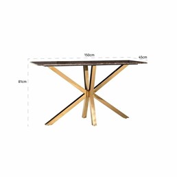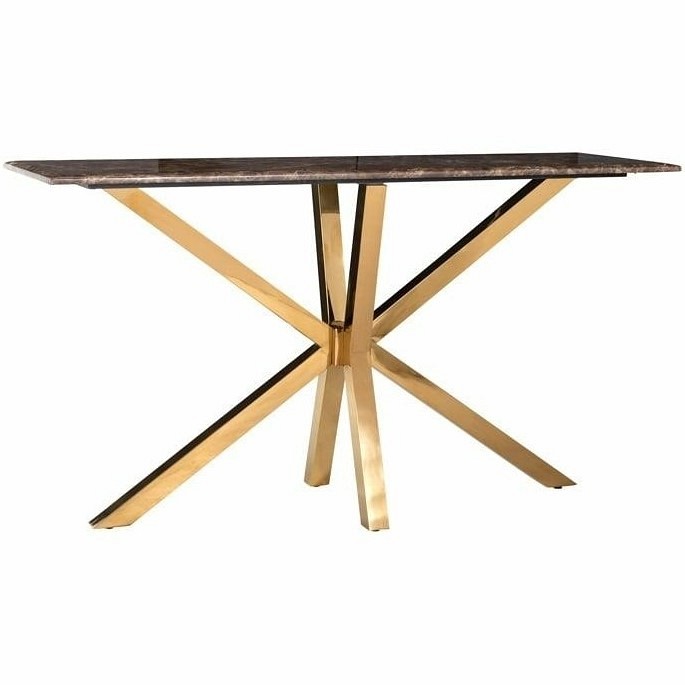 Konsola CONRAD wyróżnia elegancki oraz ponadczasowy wygląd. Blat zdobi piękny konglomerat imitujący marmur Emperador oraz metalowego stelażu w kolorze złotym.co dodaje jemu luksusowego wyglądu i stylu. Złoty stelaż oraz dodatki będzie idealnym rozwiązaniem do nowoczesnych stylów. Konsola ta idealnie sprawdzi się do wyeksponowania dekoracji w salonie, przedpokoju czy sypialni.Wybierając ten produkt możesz być pewien że dodasz do swojego salonu luksus i elegnacje.