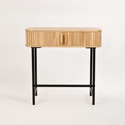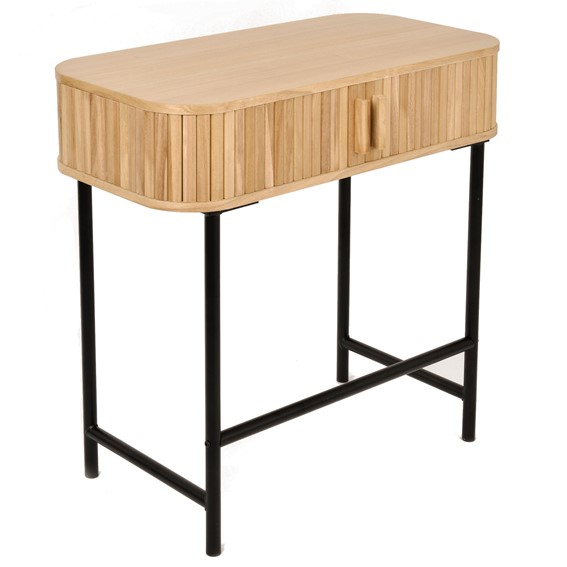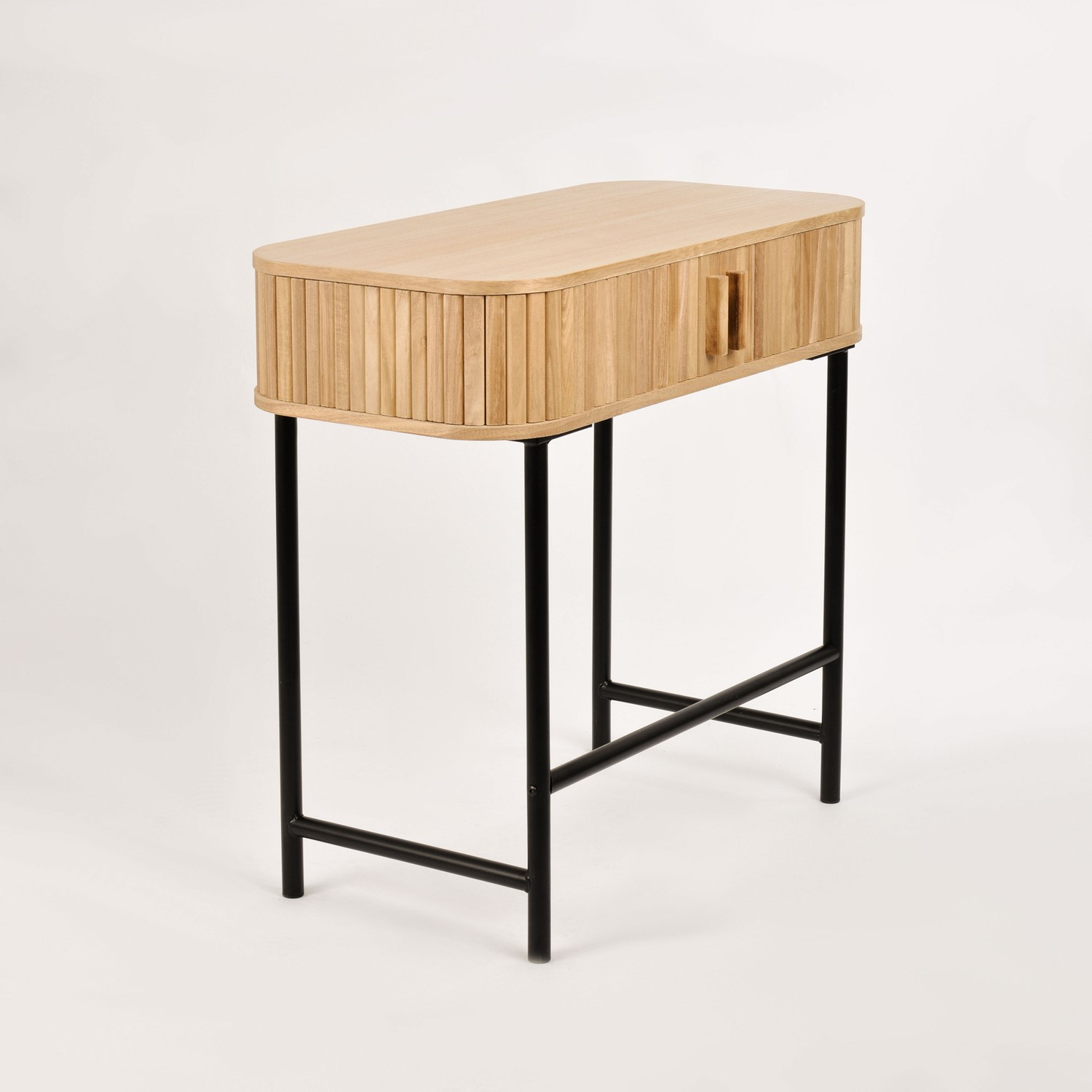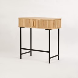 Oryginalna konsola w stylu retro to wyjątkowy element wystroju, który dodaje charakteru i uroku każdemu pomieszczeniu. Jej korpus w kolorze naturalnego drewna emanuje ciepłem i naturalnym pięknem, podczas gdy czarne, metalowe nogi nadają jej industrialnego sznytu. Najbardziej charakterystycznym elementem konsoli są przesuwne drzwi z harmonijkowych listewek, które nie tylko dodają jej oryginalności, ale także zapewniają praktyczne rozwiązanie do przechowywania przedmiotów. Ten nietypowy detal w stylu retro nadaje konsoli wyjątkowego charakteru i sprawia, że stanowi niezwykłe połączenie funkcjonalności z estetyką.