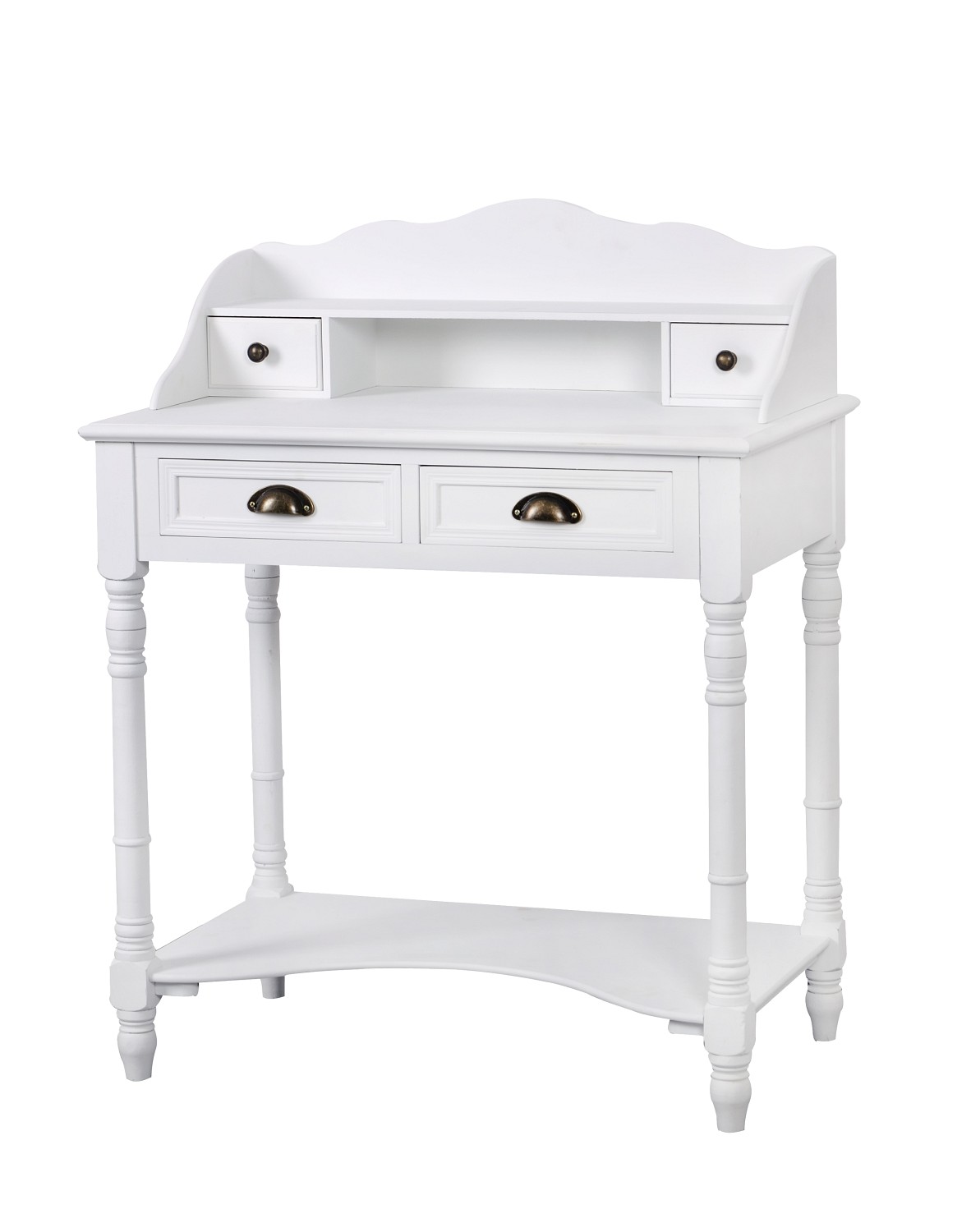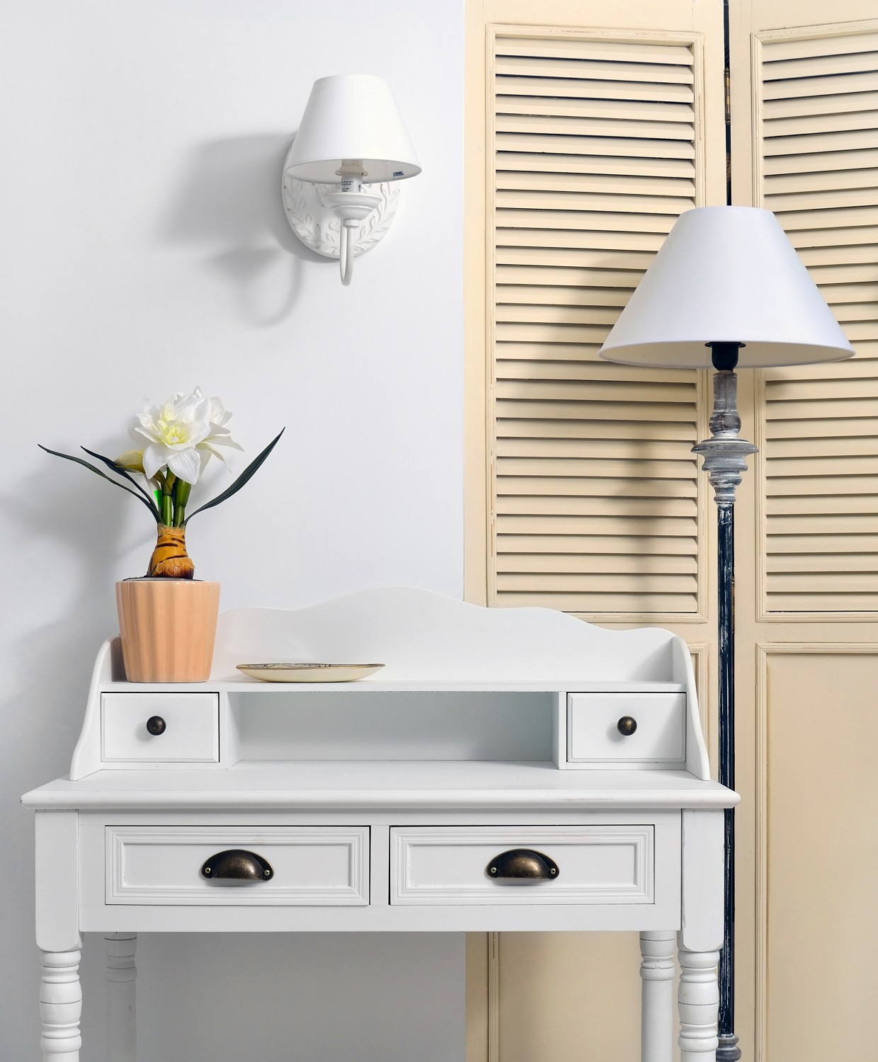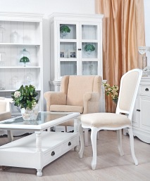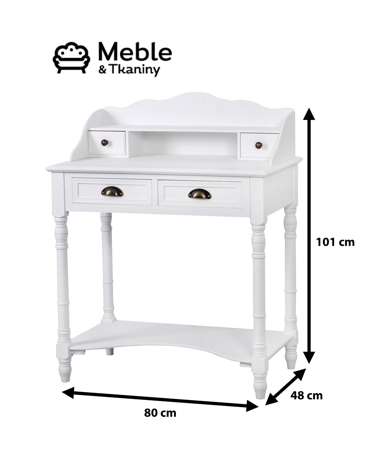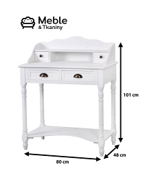 Konsola wykonana w stylu prowansalskim. Charakteryzuje się połączeniem smukłych linii i satynowej bieli. Mebel wyposażony jest w dwie półki i małą szufladkę na drobiazgi. Ozdobne, toczone nogi nadają jej uroku, a metalowe okucia wyróżniają się na tle jasnego koloru. Piękne, subtelne linie mebla nie pozwalają przejśc obok niego obojętnie. Sprawdzi się w holu. Możesz postawić na niej wazon z kwiatami lub wykorzystać np.: jako miejsce na klucze. Konsola Latina to elegancja, która zaczaruje Twoje wnętrze.
