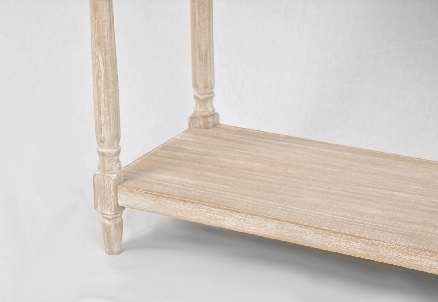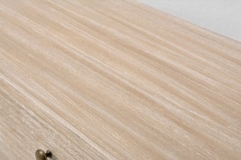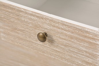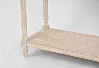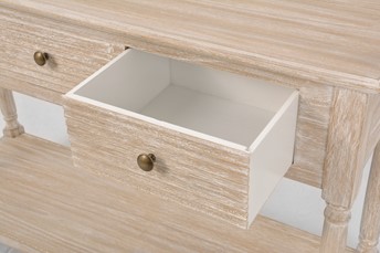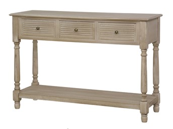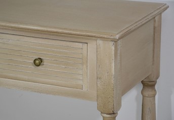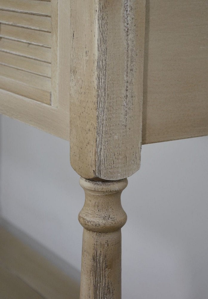 Elegancka konsola jest ręcznie malowana w stylu prowansalskim boho, z ozdobnymi metalowymi uchwytami z brązu, ozdobnymi okiennicami na frontach szuflad i tłocozne nóżkami. Frezowany korpus, blat i krawędzie są w niejednorodnym beżu z białymi rysami. Produkt posiada trzy szuflady na drewnianej prowadnicy oraz półkę.