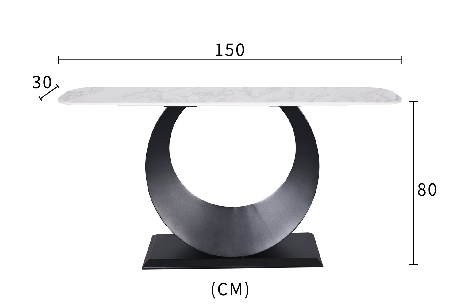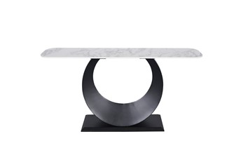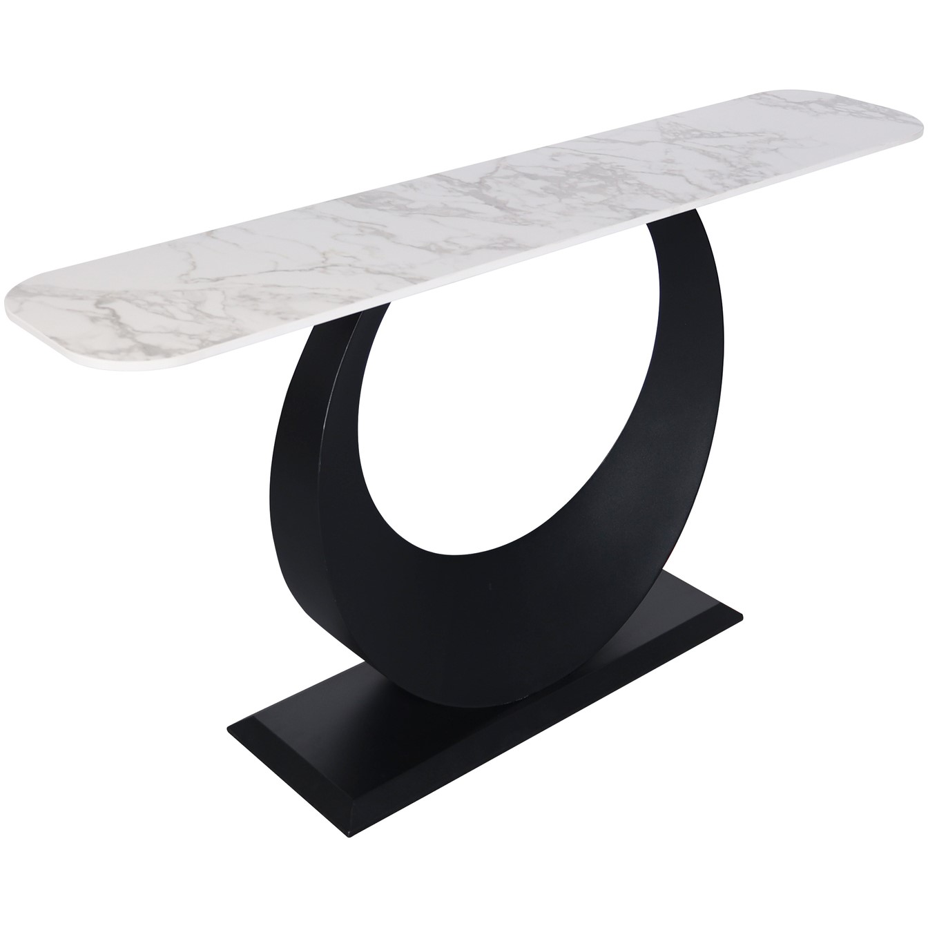 Konsola, która wyróżnia się nie tylko swoim wyglądem, ale również swoją wyjątkową konstrukcją. Ta konsola to prawdziwa poezja formy i stylu, idealna dla tych, którzy poszukują czegoś wyjątkowego do swojego wnętrza. Jej solidna konstrukcja wykonana z żelaza w głębokim, eleganckim kolorze czarnym, nadaje jej charakteru i trwałości. Jednak to nie wszystko, co ją wyróżnia. Jej najbardziej znaczącą cechą jest bez wątpienia wyjątkowy blat imitujący marmur, który dodaje konsoli niepowtarzalnego uroku i luksusowego wyglądu. Kształt konsoli jest równie unikalny, przypominający księżyc osadzony na prostokątnej podstawie. To połączenie delikatnych, zaokrąglonych linii z solidną podstawą tworzy harmonijną kompozycję, która zachwyci każdego miłośnika designu.