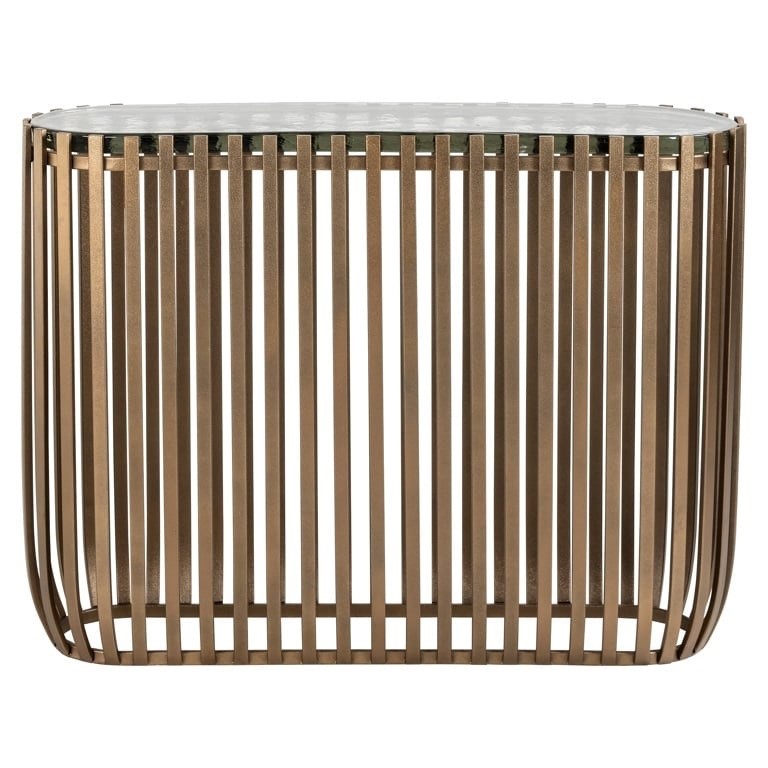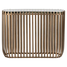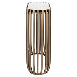 Okrągły, szklany blat oparto na ciekawie zdobionej podstawie wykonanej z metalu w złotej matowej kolorystyce.
