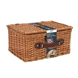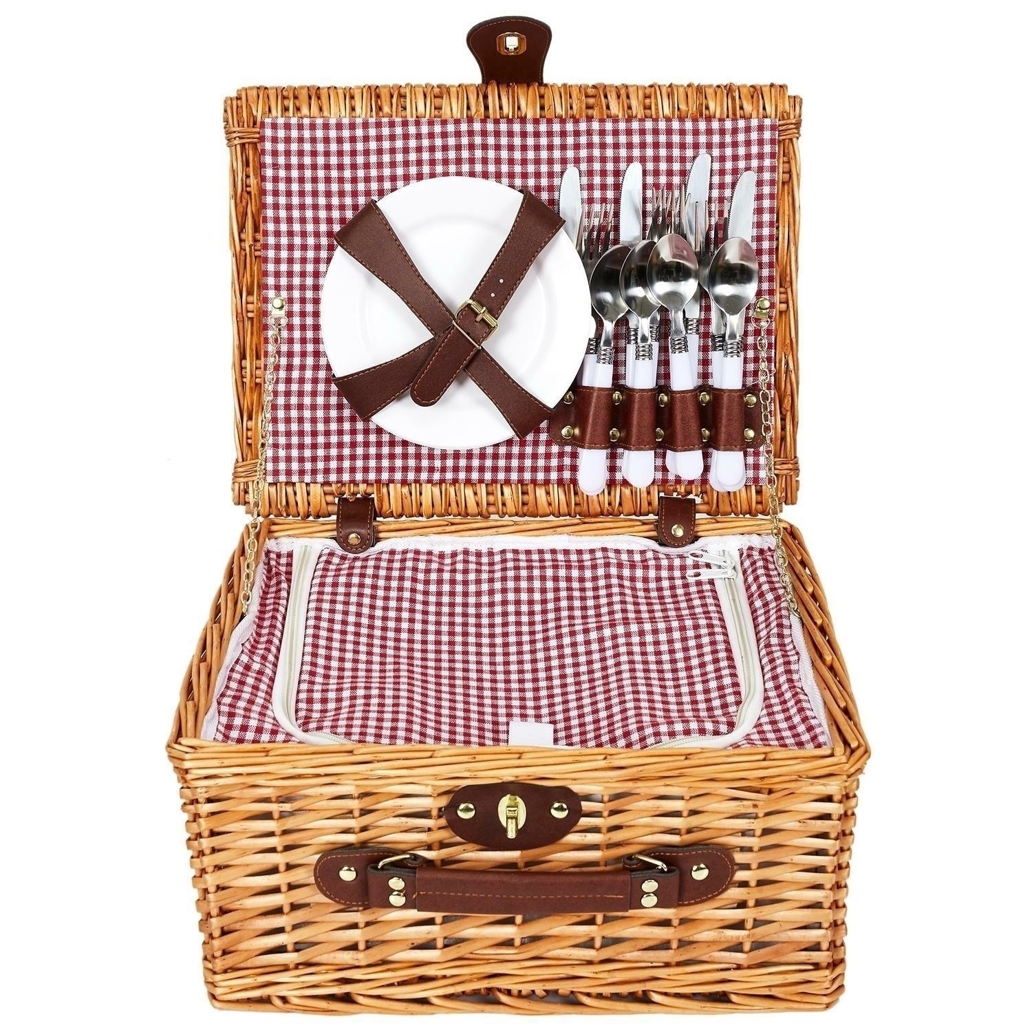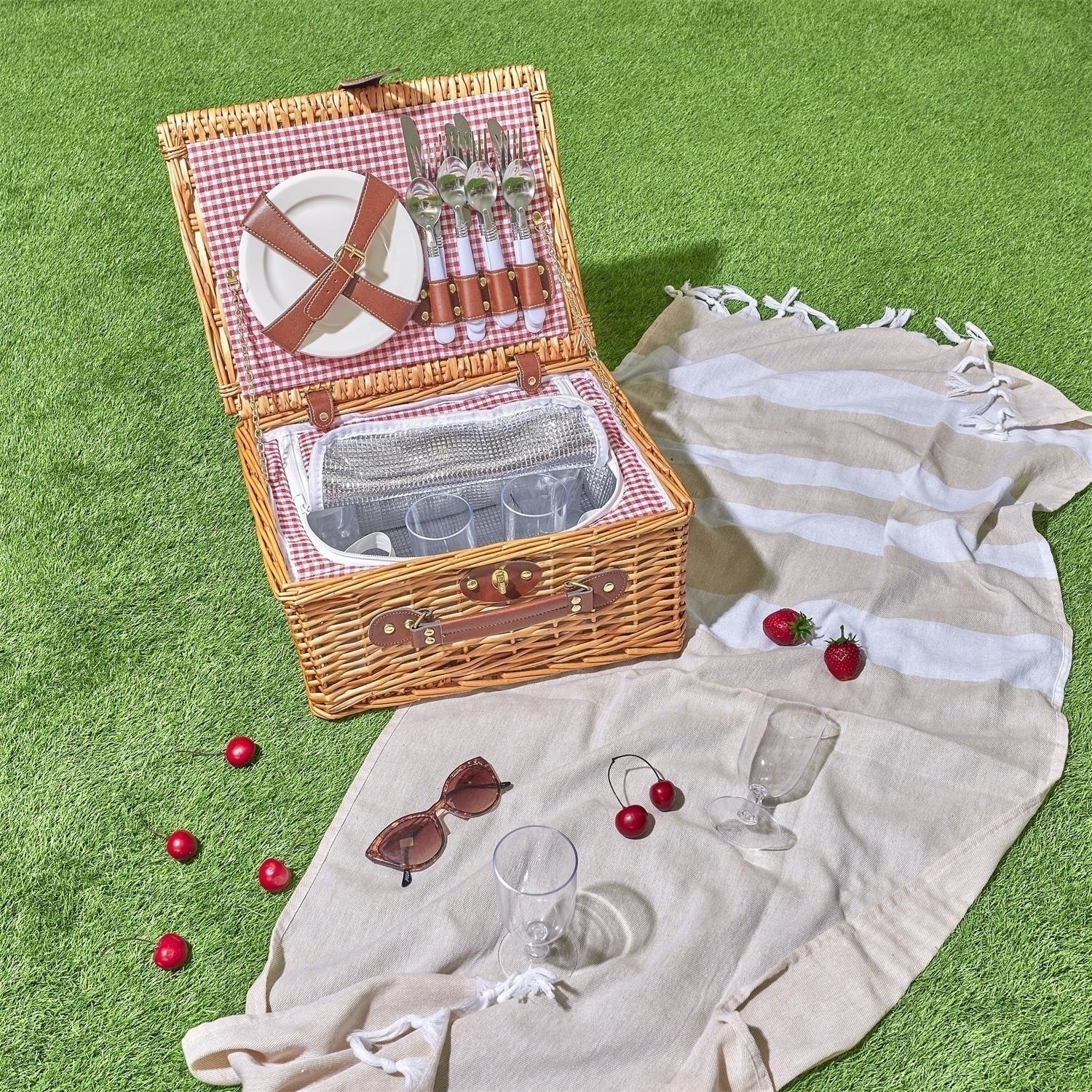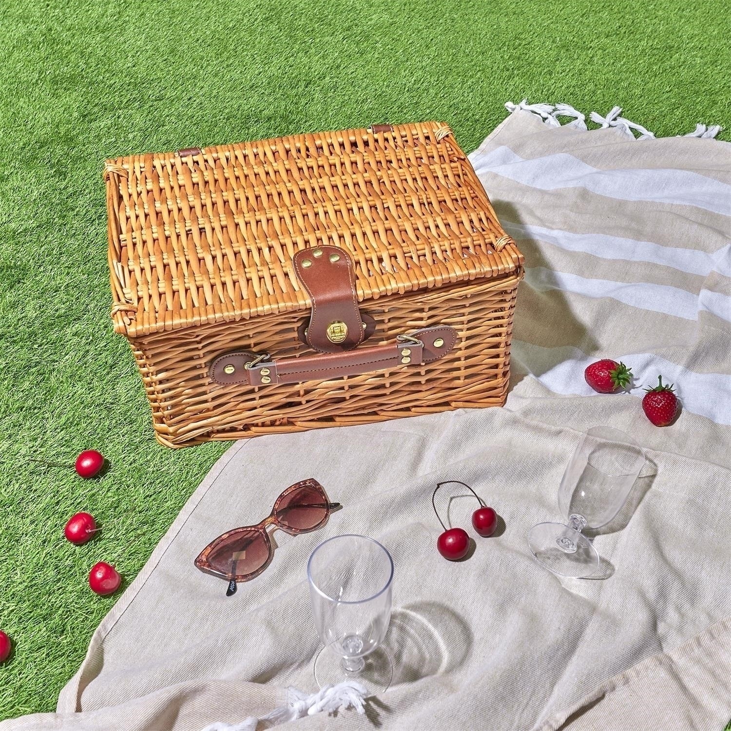 Wiklinowy kosz piknikowy z pełnym zestawem naczyń dla czterech osób to idealny towarzysz letnich wypraw. Jego klasyczne wzornictwo i trwała konstrukcja sprawiają, że jest zarówno praktyczny, jak i estetyczny.