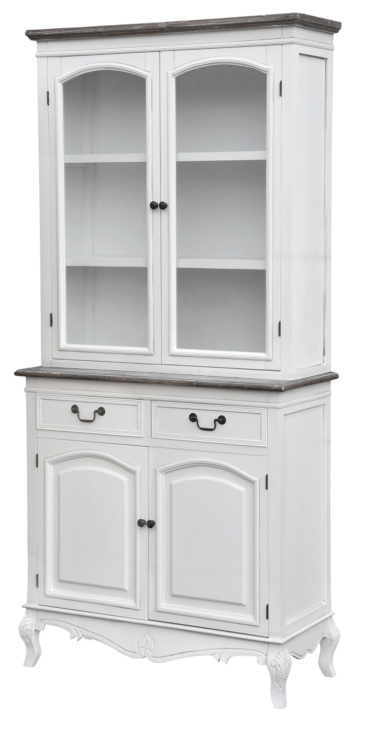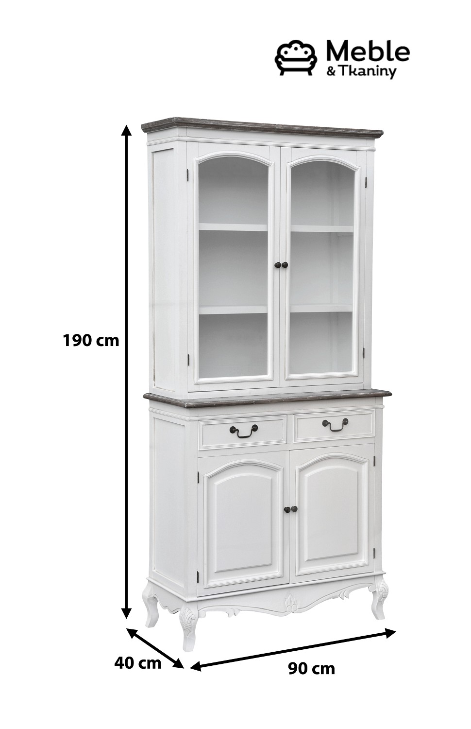 Kredens inspirowany stylem francuskim wykonany jest z drewna topoli i MDF. Składa się z dwóch części: komody oraz przeszklonej góry. za drzwiczkami nie ma półki - znajduje się tam jedna duża przestrzeń, dzięki czemu z łatwością przechowasz w niej przedmioty o większych gabarytach. Za szkłem możesz postawić ulubioną porcelanę, aby cieszyła Twoje oko każdego dnia. Dwie szufladki są idealne do przechowywania rozmaitych drobiazgów: sztućców czy serwetek. Liczne rzeźbienia, okucia i gięte nóżki, dodają meblowi charakteru i sprawiają, że jest jedyny w swoim rodzaju.
