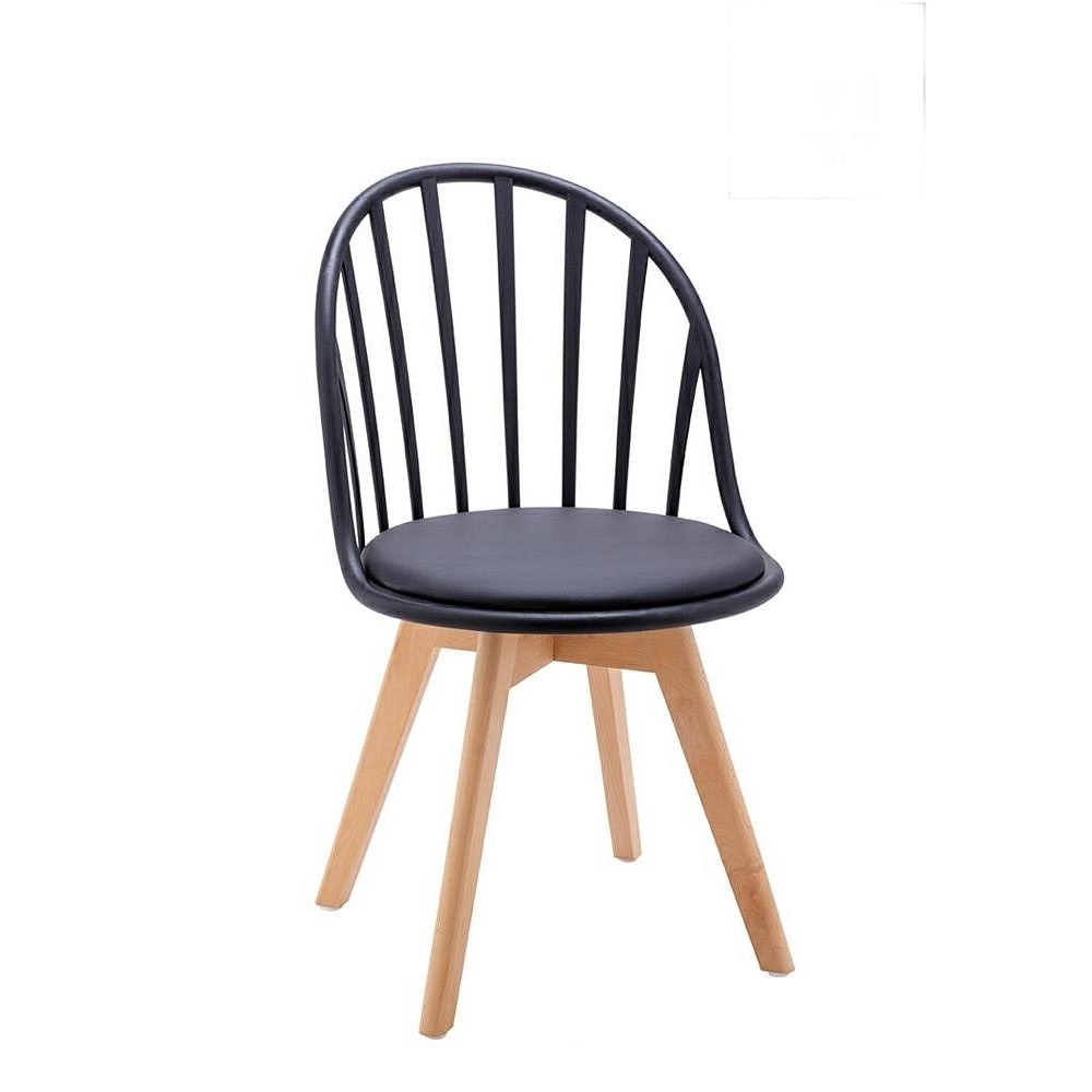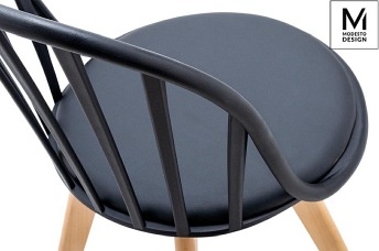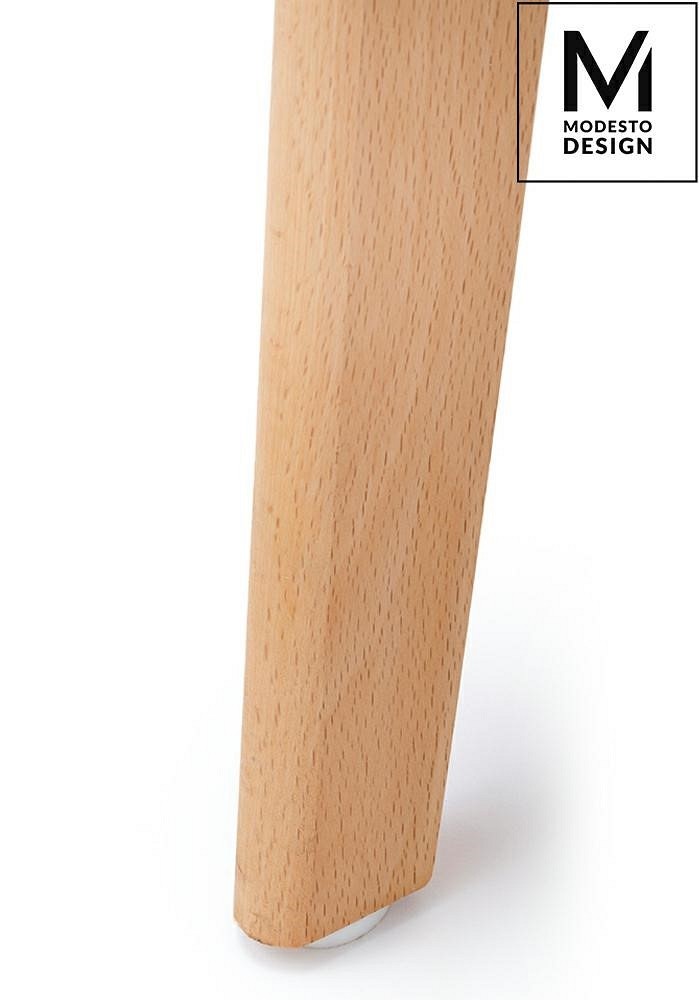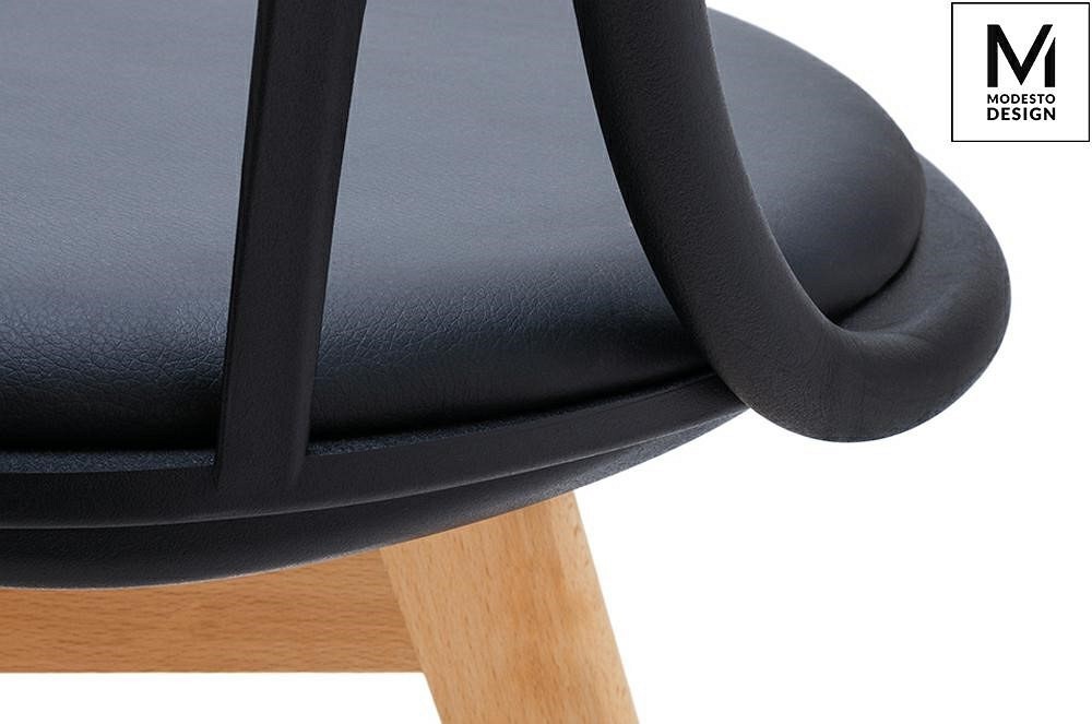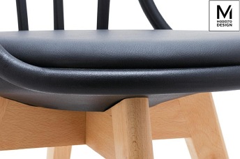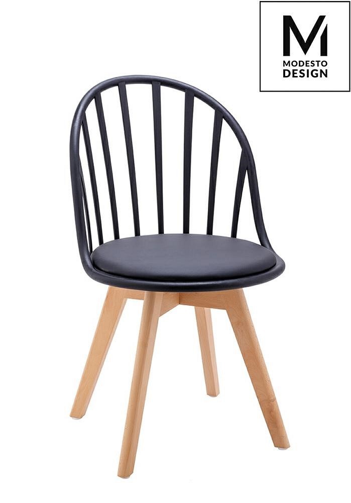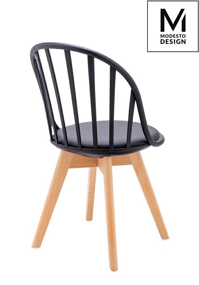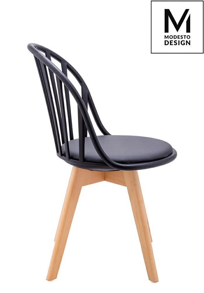 Krzesło ALBERT marki MODESTO DESIGN. Klasyczne krzesło w nowoczesnym wydaniu. Konstrukcja wykonana z polipropylenu w kolorze czarnym matowym. Na siedzisku znajduje się miękka poduszka, tapicerowana czarną ekoskórą. Podstawa wykona z naturalnego drewna bukowego. Doskonałe krzesło do jadalni lub salonu. Waga netto 1 szt.: 4,5 kg Waga z opakowaniem: 5,5 kg Maksymalna ilość szt. w opakowaniu: 2 Wymiary paczki: 69 cm x 52 cm x 50 cm Sposób wysyłki: Paczka Produkt do samodzielnego montażu: Tak