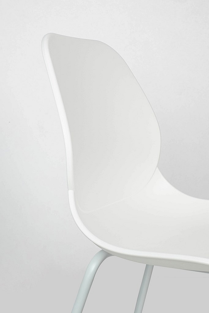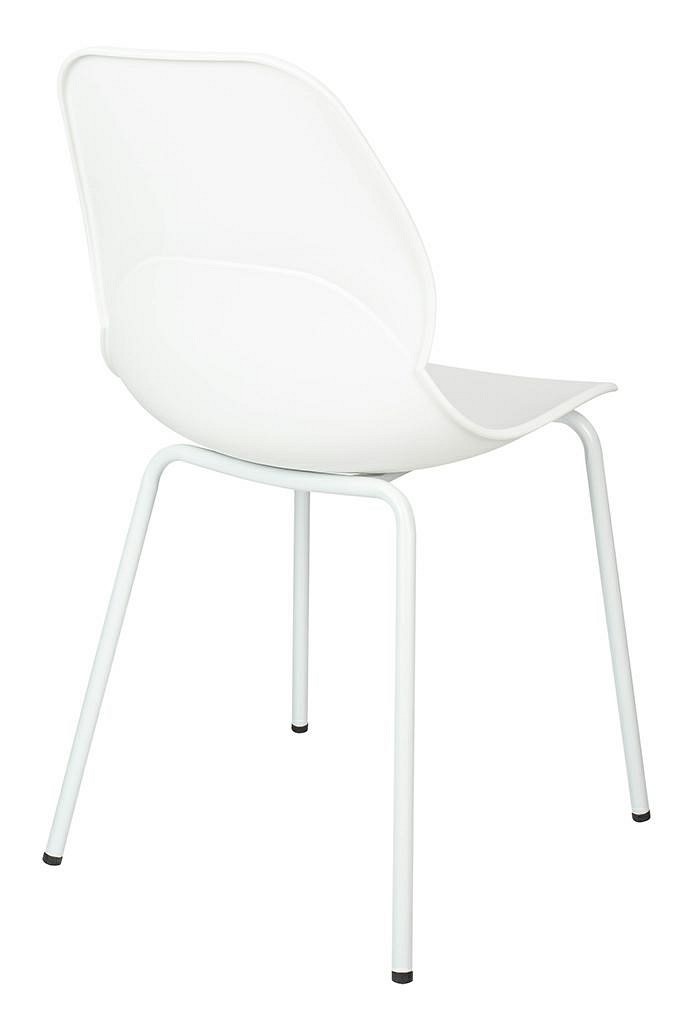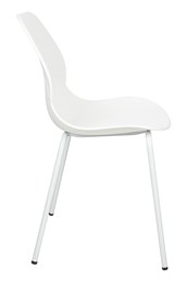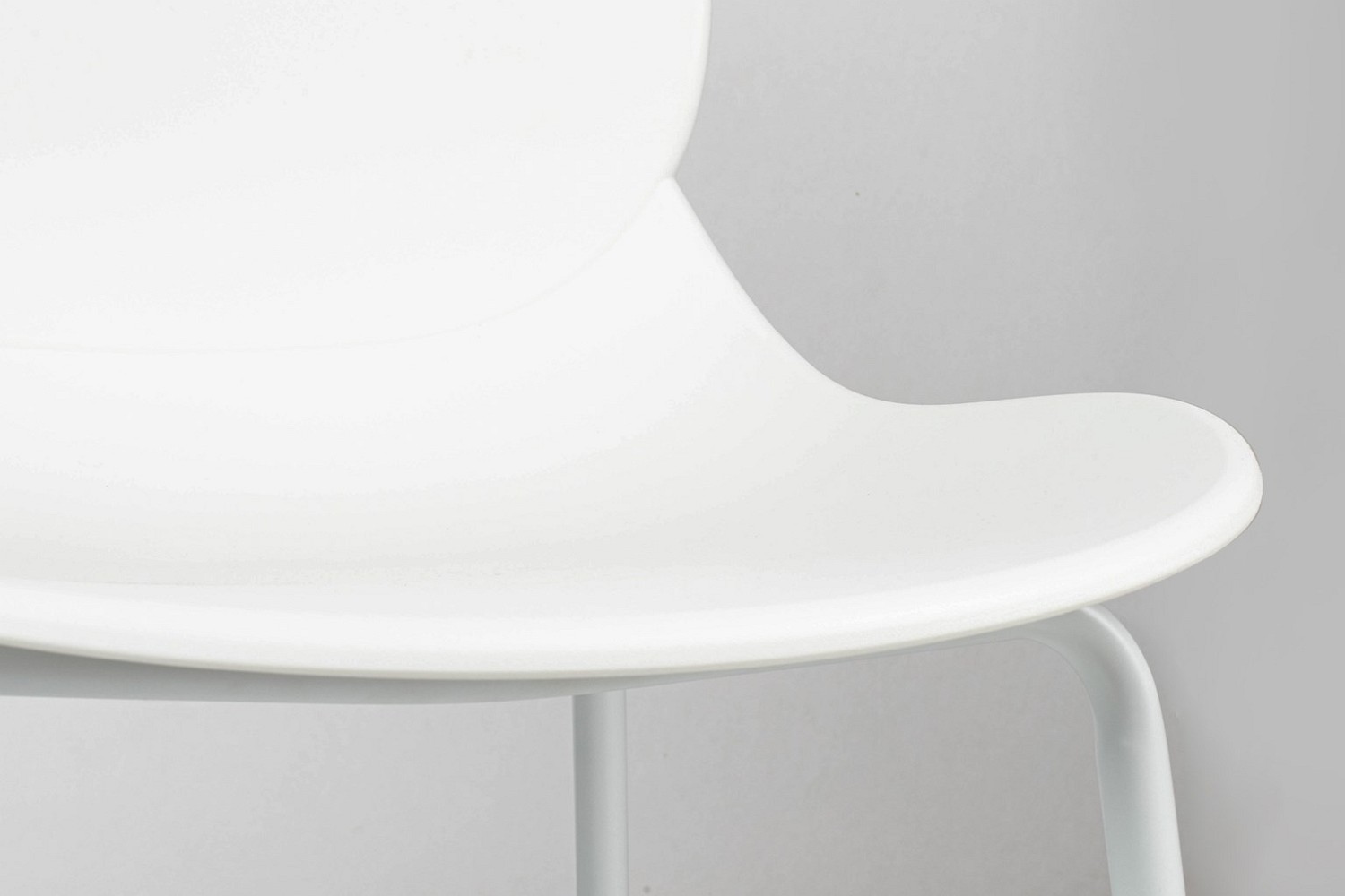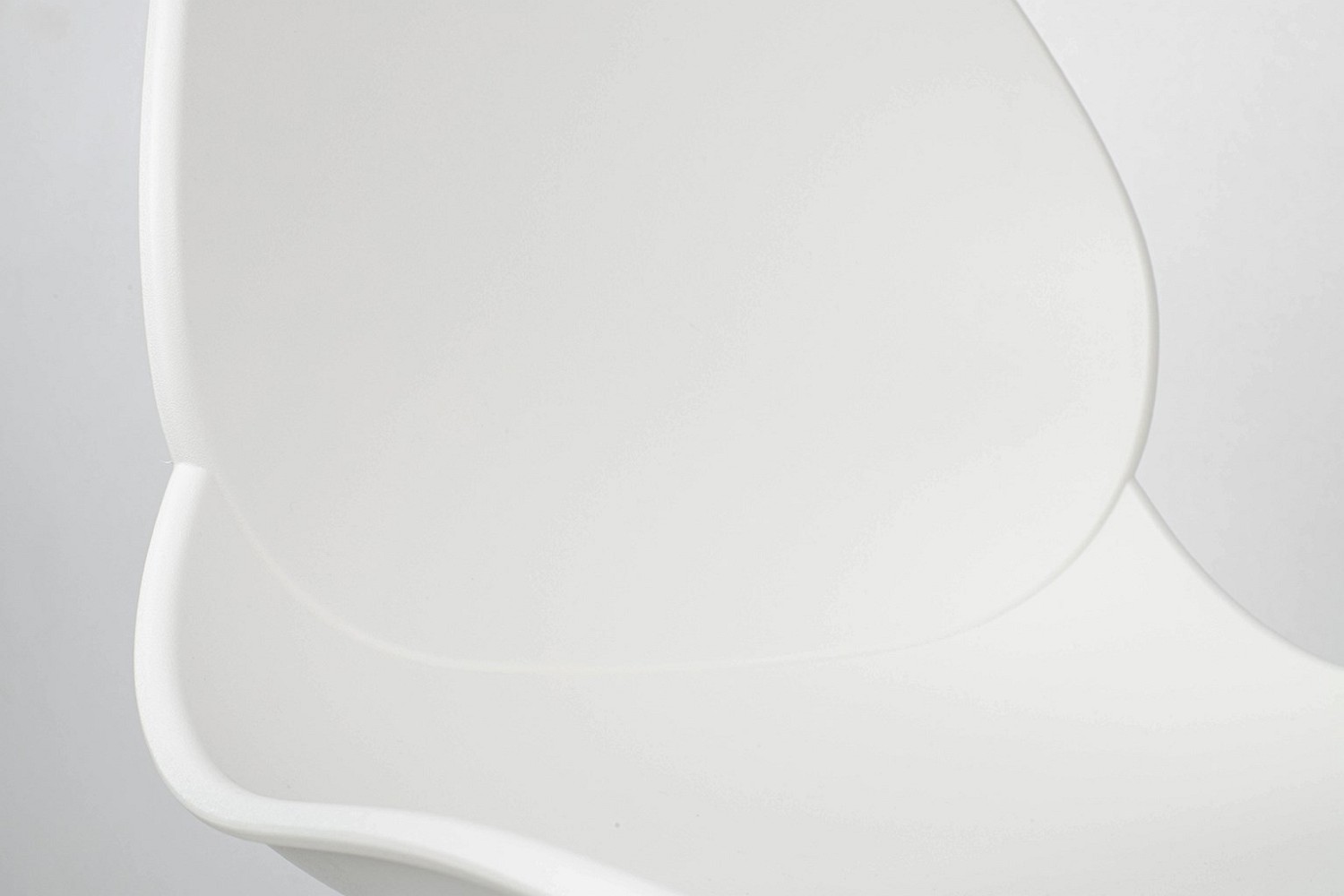 Profilowane siedzisko zostało wykonane z polipropylenu w kolorze białym, a podstawa z metalu.