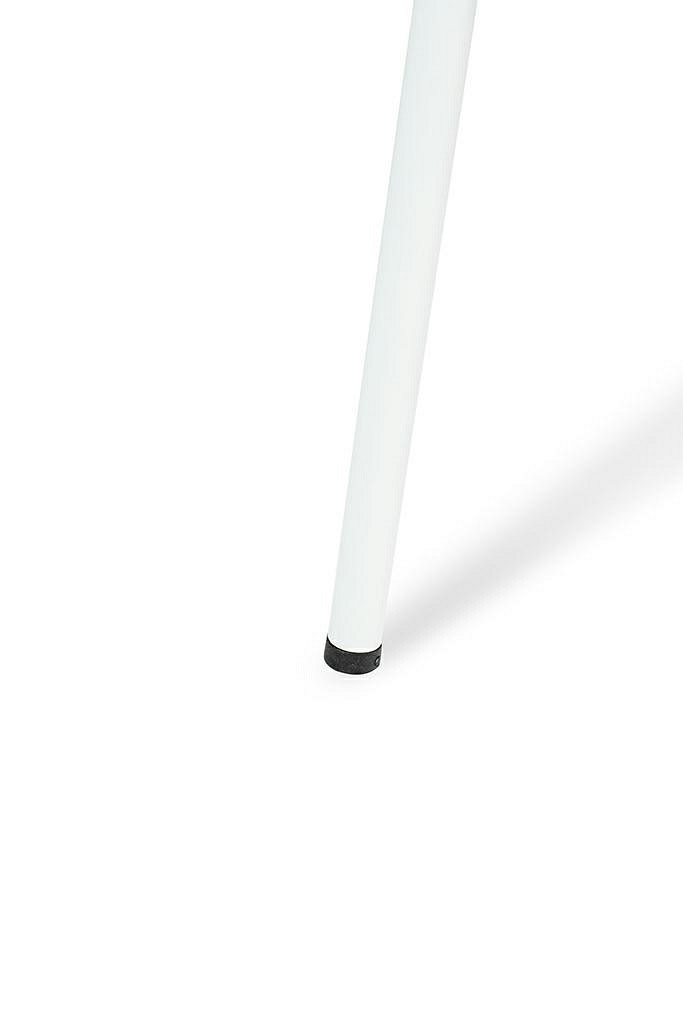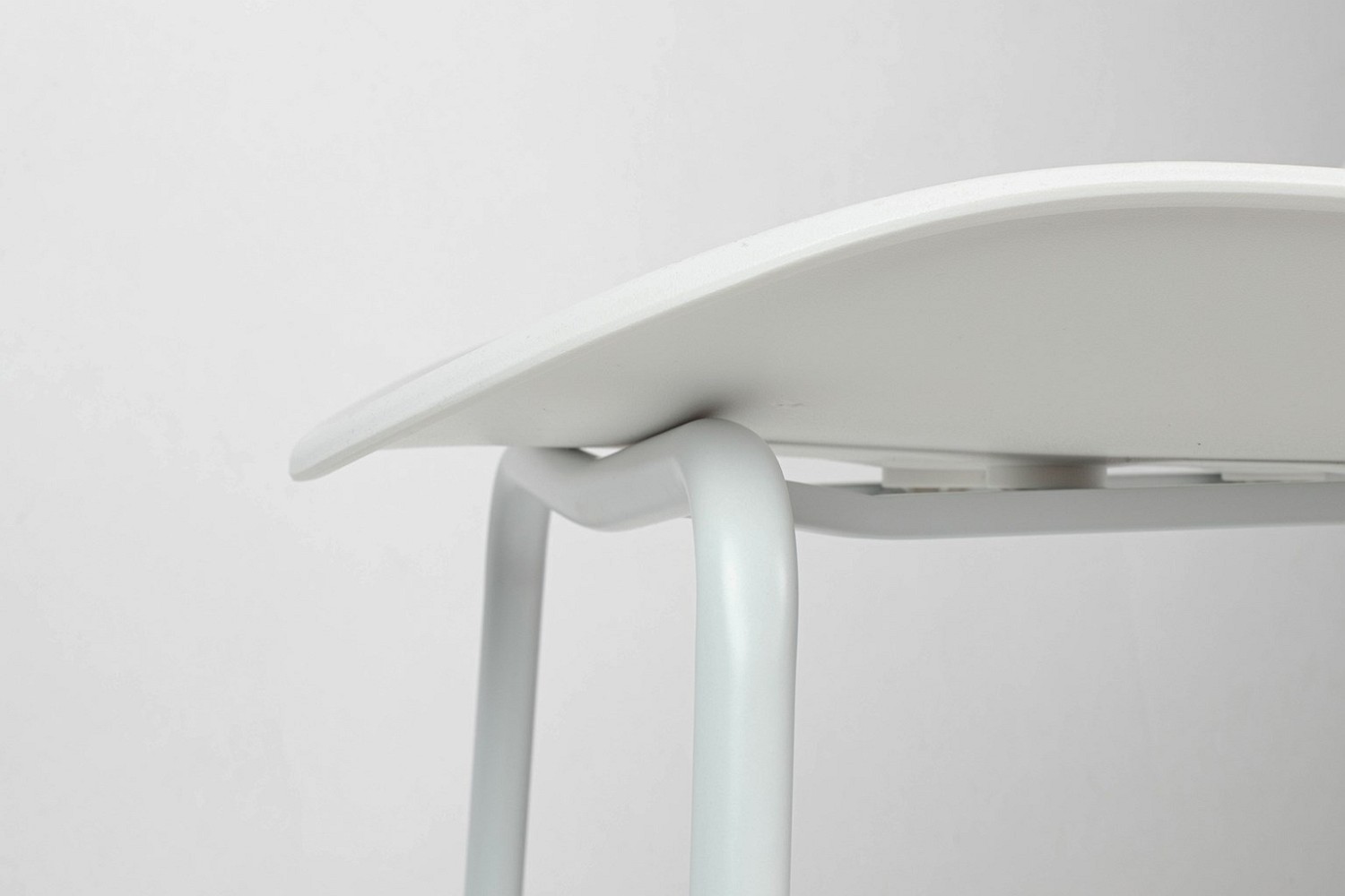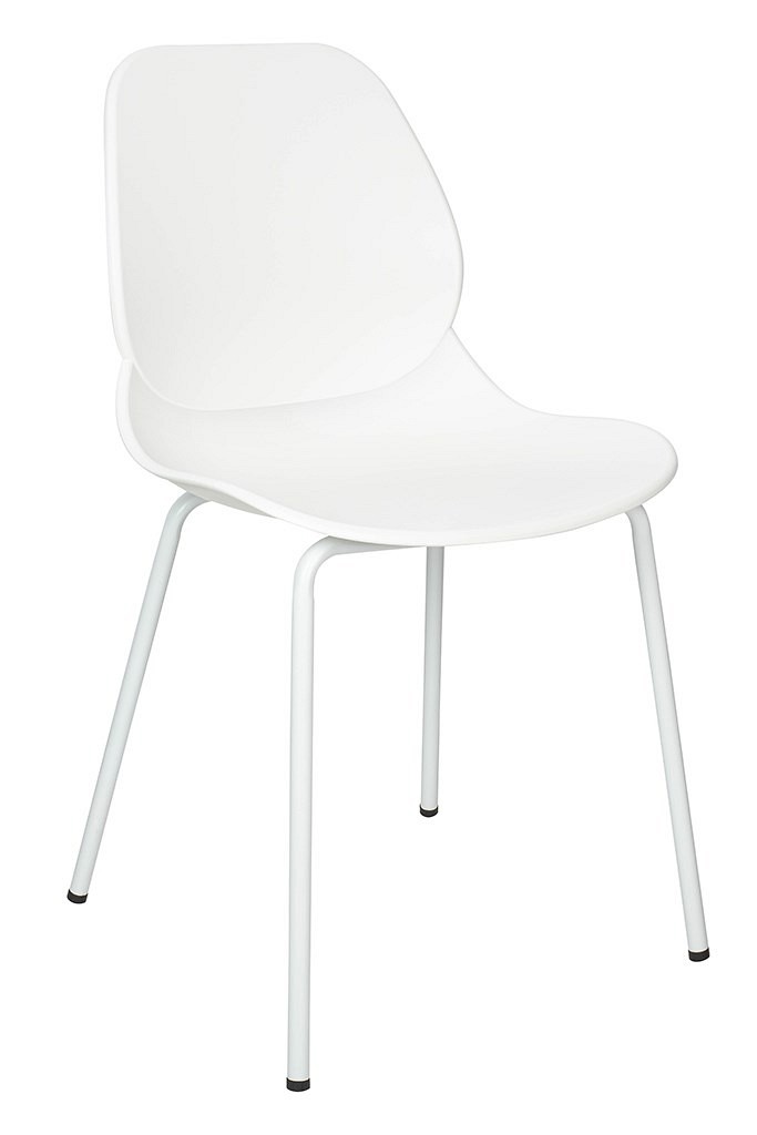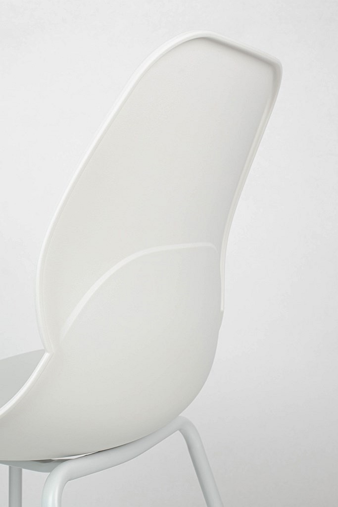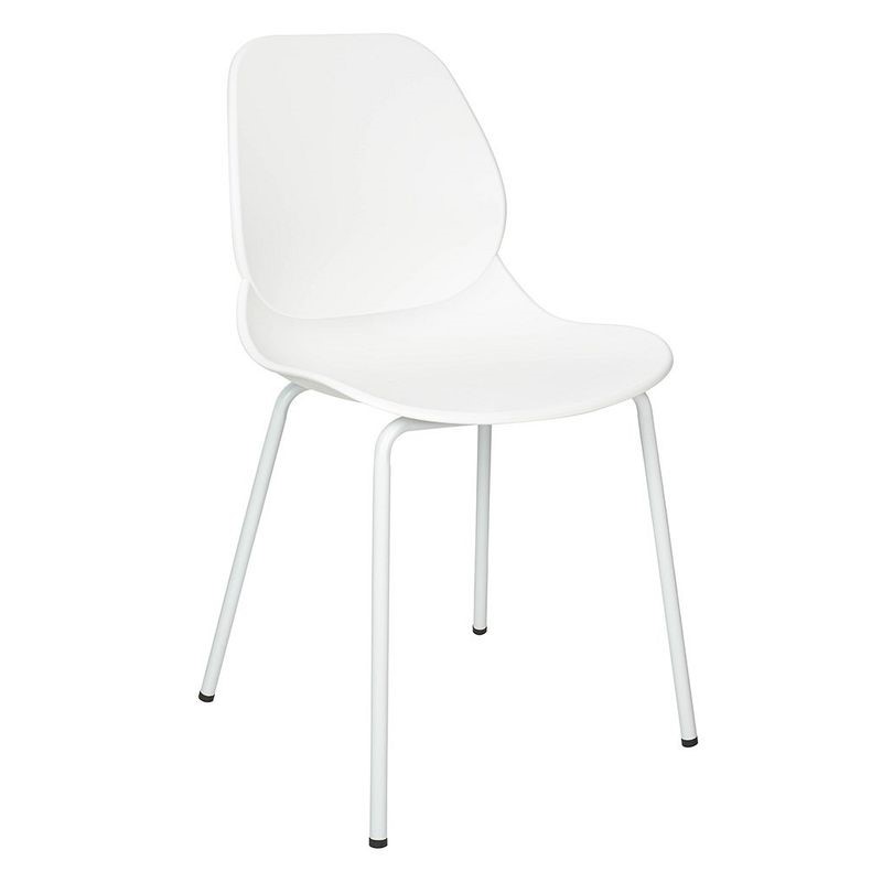 Profilowane siedzisko zostało wykonane z polipropylenu w kolorze białym, a podstawa z metalu.