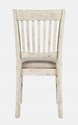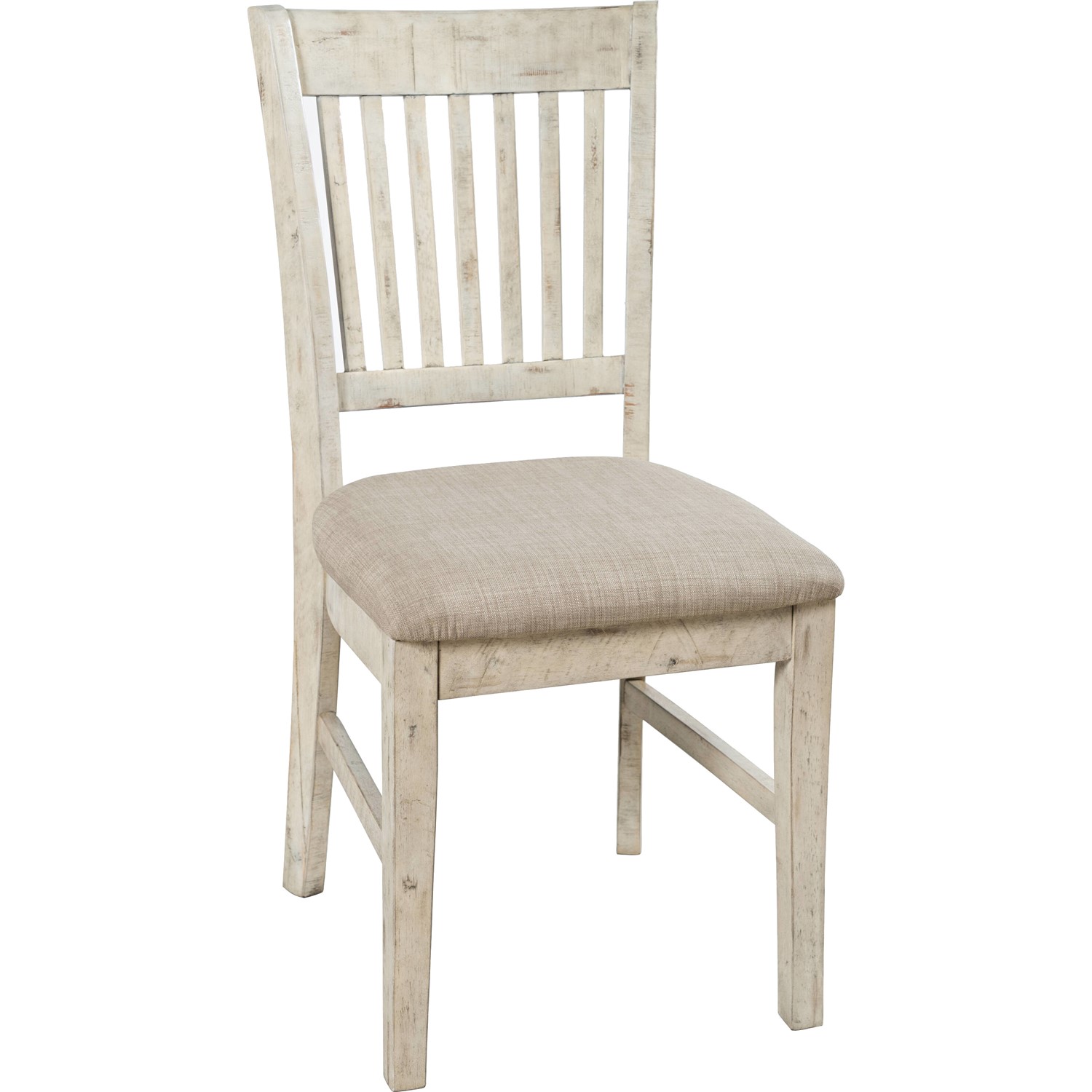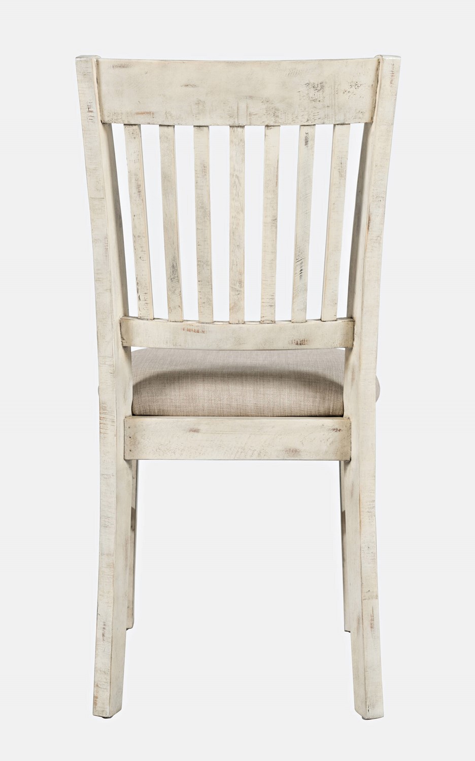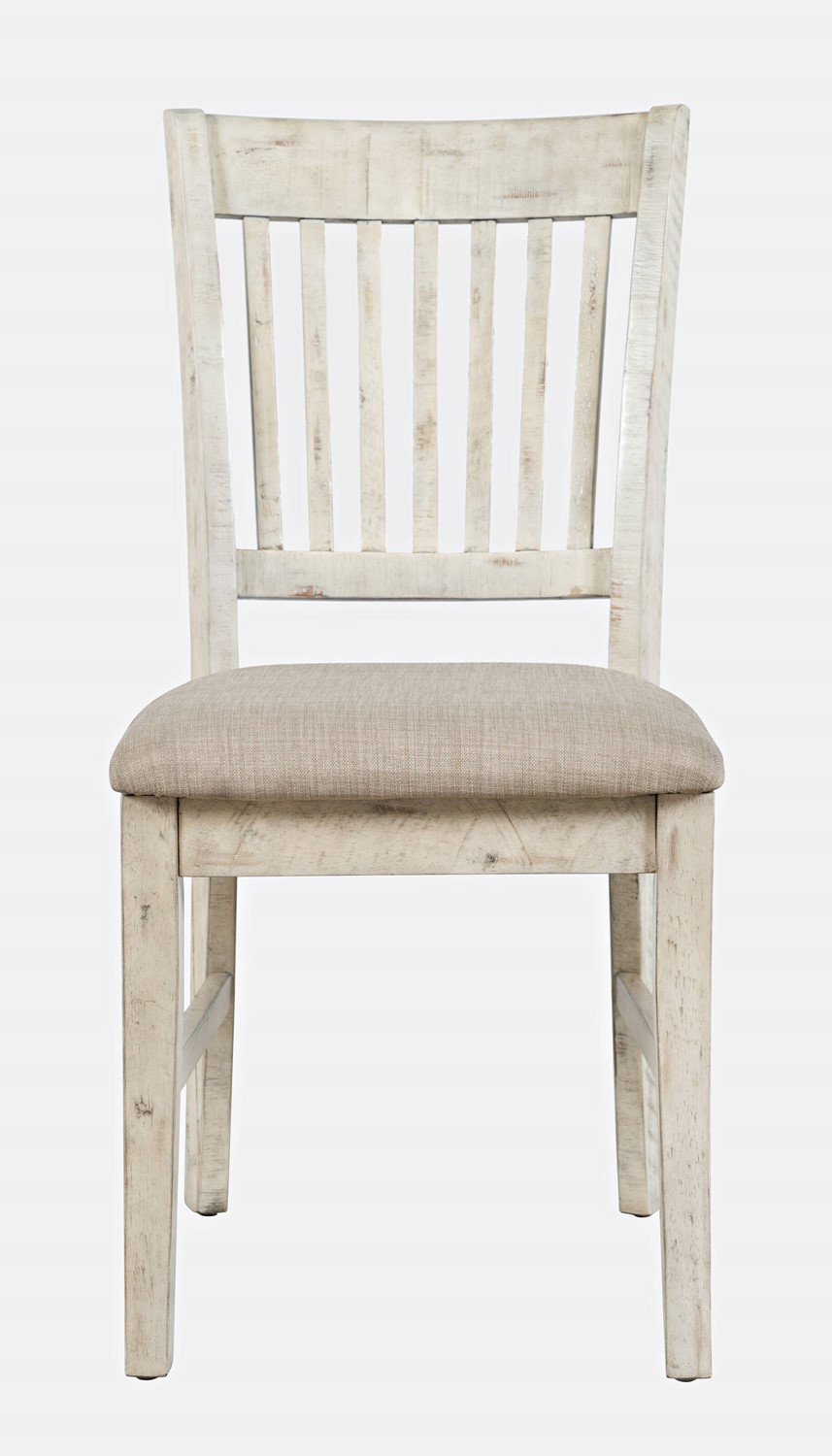 Krzesło tapicerowane o rustykalnym wdzięku, w kolorze kremowym z urokliwymi przetarciami shabby-chic. Prosta forma z surowym wykończeniem zyskuje kontrast dzięki plecom z pionowymi listewkami.