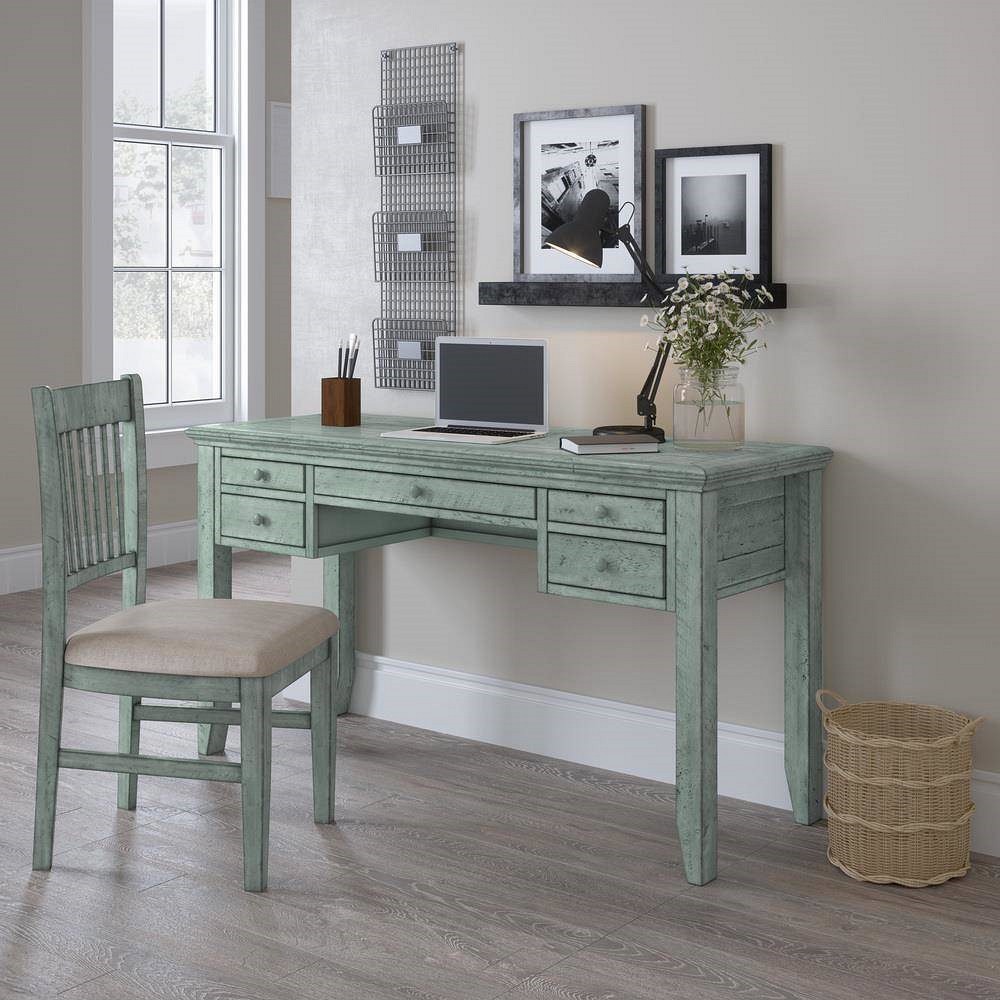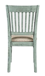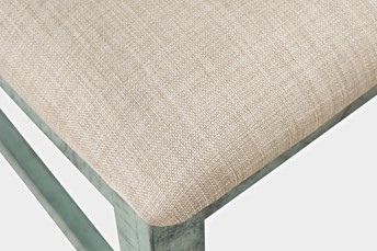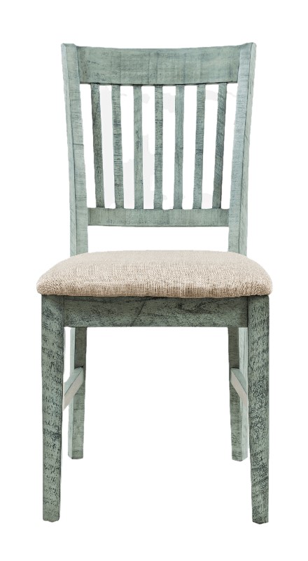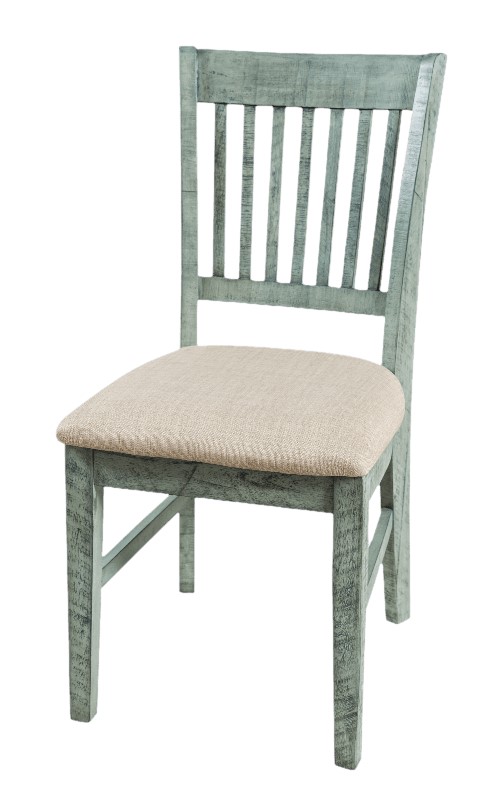 Krzesło tapicerowane w stylu rustykalnym w oryginalnym kolorze turkusowo-miętowym z luksusowymi, charakterystycznymi śladami użytkowania. Prosty kształt o chropowatym wykończeniu przełamuje oparcie z pionowej belki. Niejednolita kolorystyka w połączeniu z widoczną strukturą drewna i kornikowaniem nadaje meblom oryginalny wygląd i doskonale komponuje się z biurkiem z tej serii, które będzie klasycznym akcentem, ciekawym w każdym wnętrzu.
