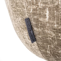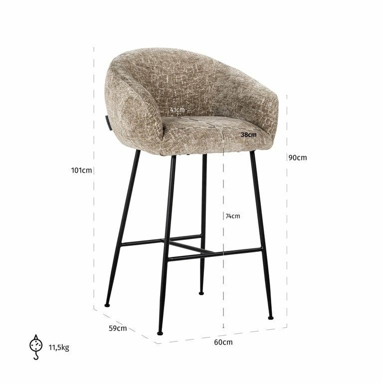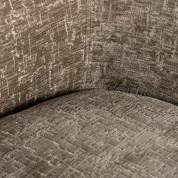 Siedzisko zostało obite piękną tkaniną poliestrową w odcieniu brązowym i wyposażone w smukłe, metalowe nogi z podnóżkiem w kolorze czarnym.