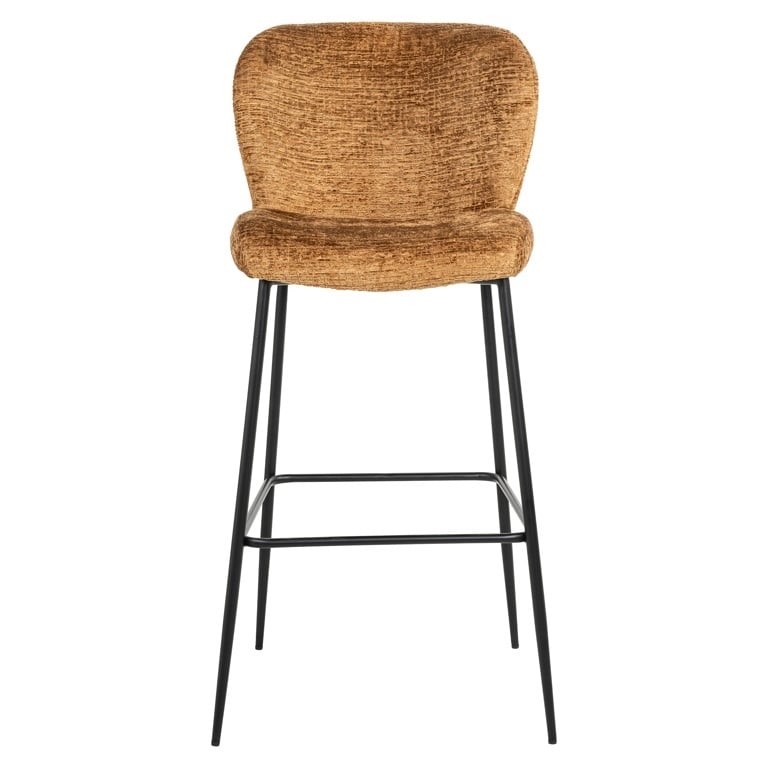 Dzięki smukłej sylwetce, czarnej metalowej podstawie i zgrabnemu pomarańczowemu siedzisku.