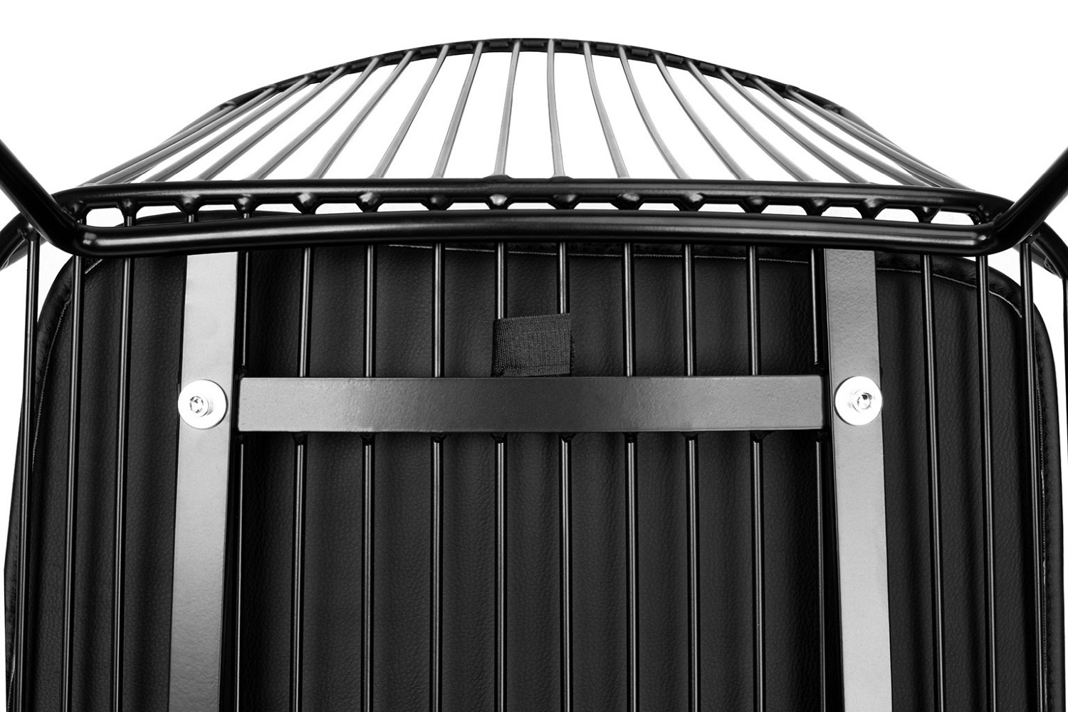 Piankowa poduszka z czarnej ekoskóry nieco przełamuje surowość stalowej konstrukcji.