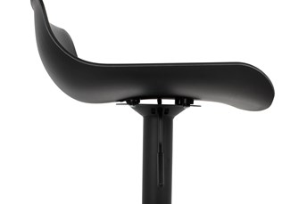 Siedzisko zostało wykonane z tworzywa sztucznego, a postawa z metalu w kolorze czarnym.