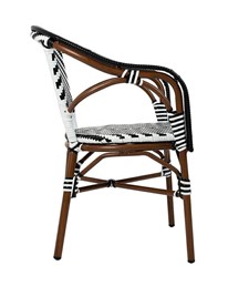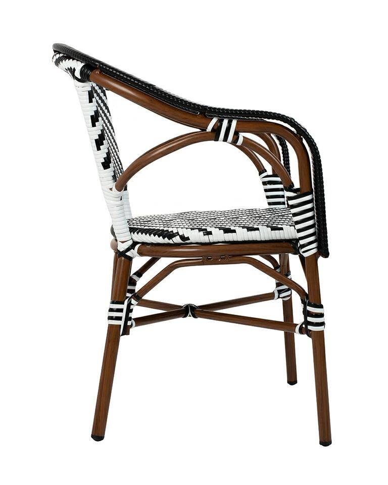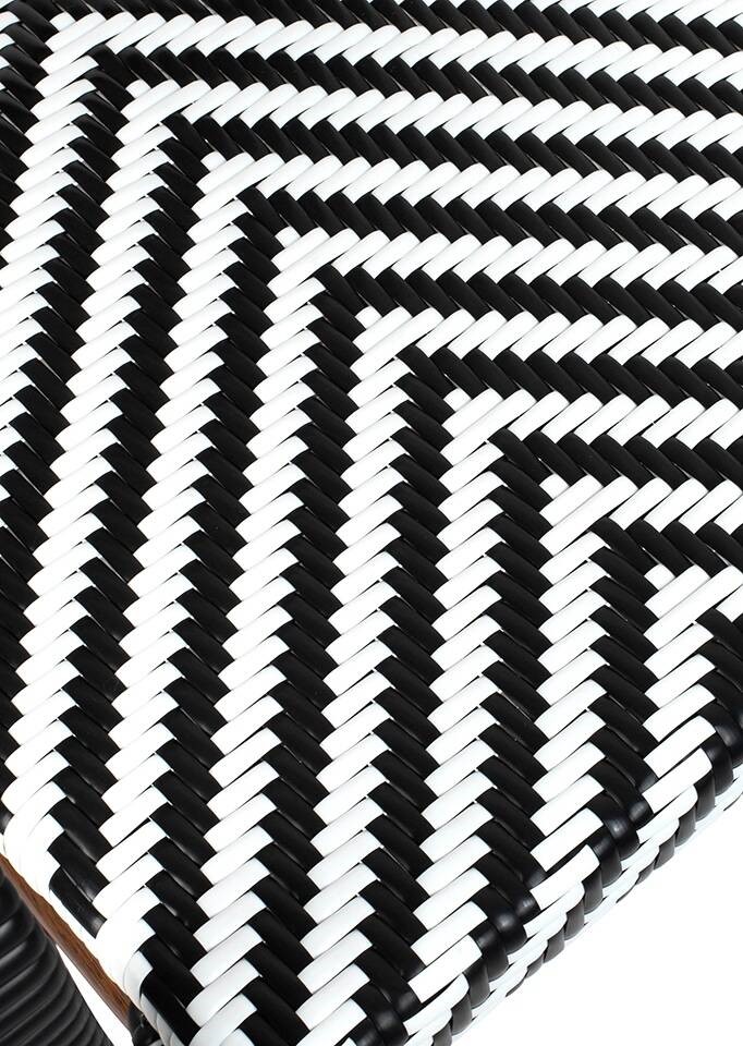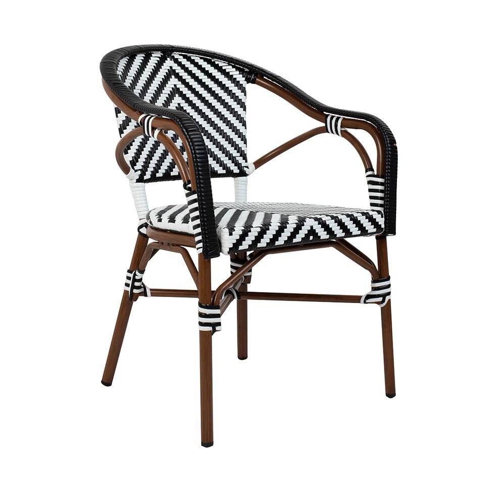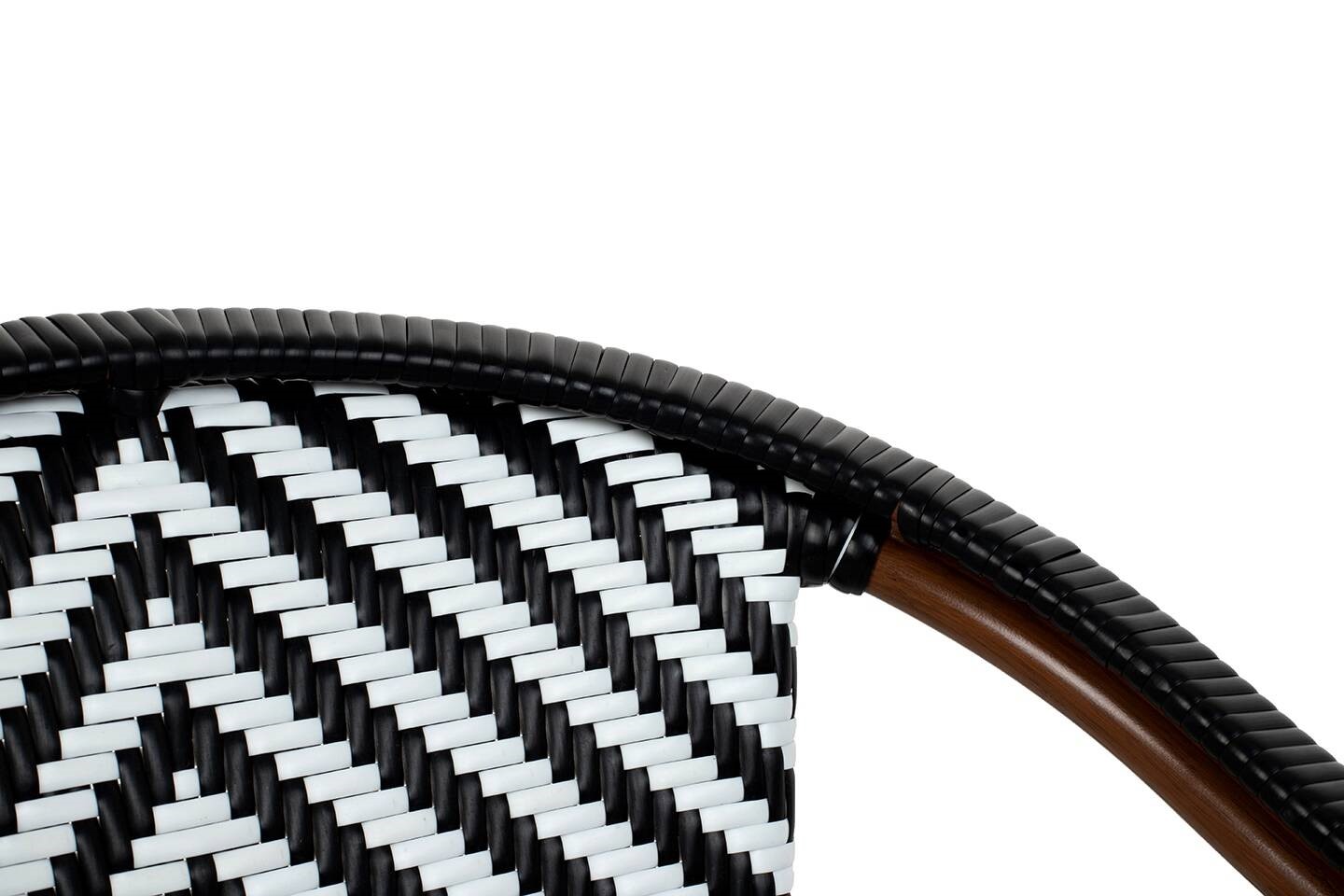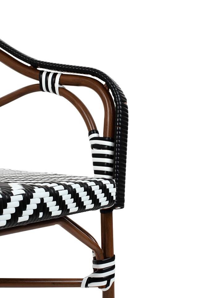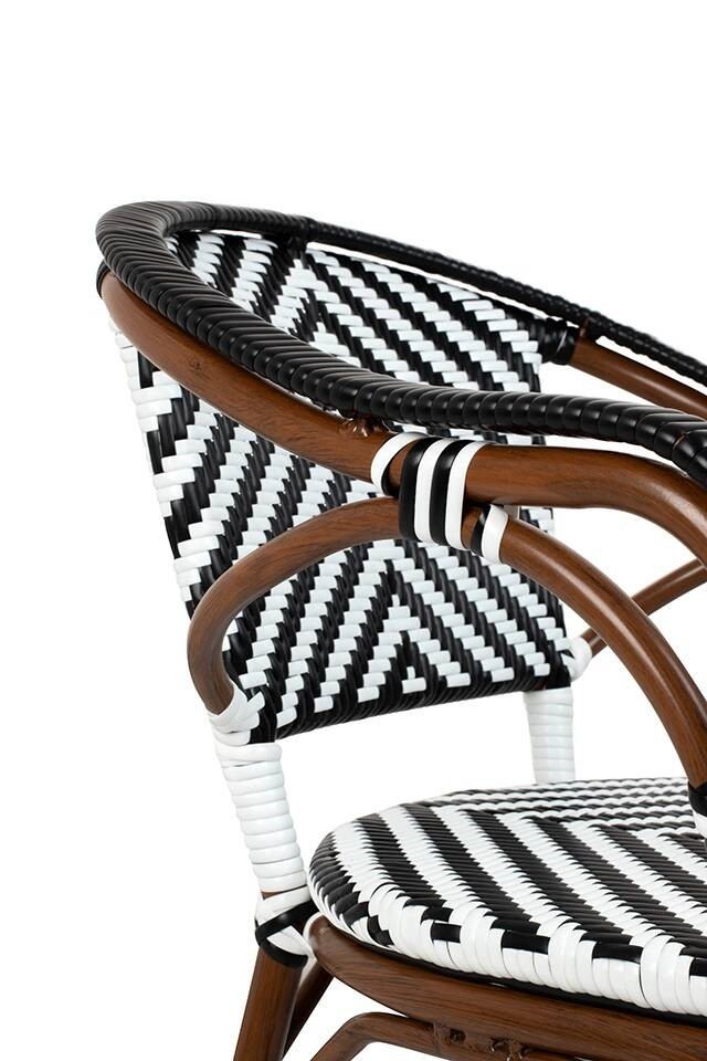 Wygodne siedzisko wraz z podłokietnikami wykonano z wikliny syntetycznej i wykończono w eleganckiej kolorystyce biało-czarnej, która jest odporna na promieniowanie UV. Dużym atutem jest możliwość sztaplowania, dzięki czemu będzie produktem praktycznym do ogródka czy restauracji. Dostępne są różne wersje kolorystyczne oraz stolik z kolekcji.
