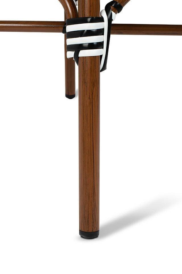 Krzesło zostało wykonane w całości z aluminium, co nadaje mu lekkości i trwałości. Efekt drewna orzechowego dodaje elegancji, a wygodne siedzisko z podłokietnikami, wykonane z wikliny syntetycznej, zapewnia komfort użytkowania. Dodatkowym atutem jest elegancka kolorystyka biało-czarna, odporna na promieniowanie UV, co czyni je idealnym wyborem na zewnątrz.
