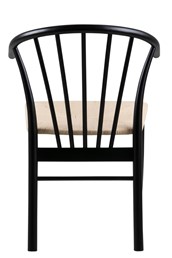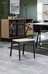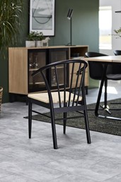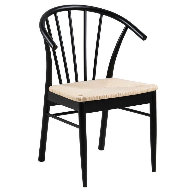Krzesło Cassandra z podłokietnikami to mebel, który idealnie pasuje do wnętrz w stylu boho czy skandynawskim. Posiada wygodne i ergonomiczne podłokietniki oraz szerokie siedzisko. Wykonany jest z papierowej plecionki, który nie tylko wygląda ciekawie i estetycznie, ale jest również bardzo wytrzymała. Drugim elementem krzesła jest czarne drewno. Podstawa krzesła to cztery nogi, przednie nogi zwężają się ku dołowi. Tylnie, nieco szersze, płynnie przechodzą w oparcie. Oferuje pełne podparcie pleców i składa się z siedmiu pionowych elementów ułożonych w kształcie wachlarza.