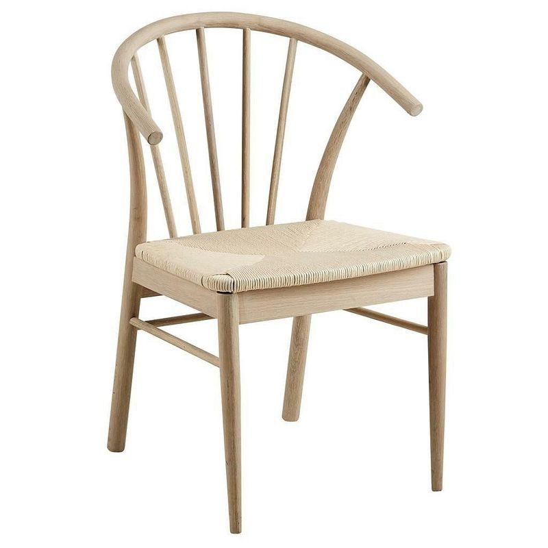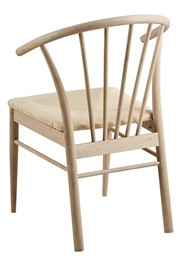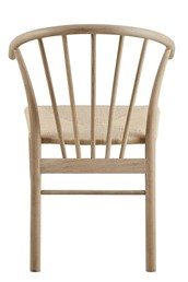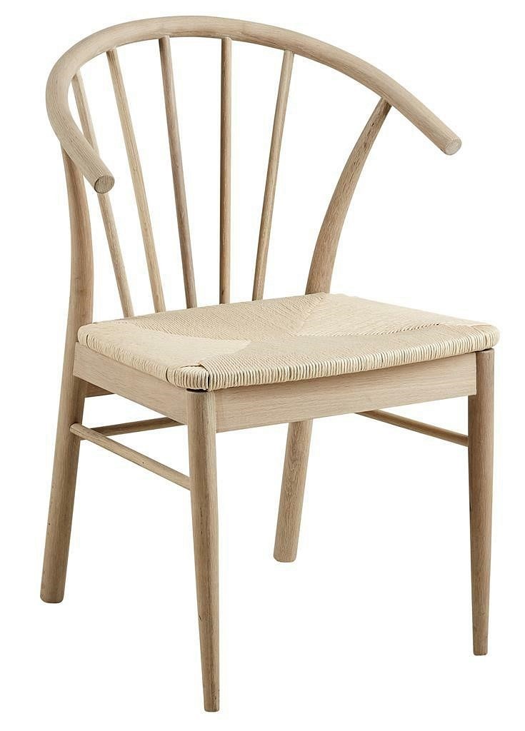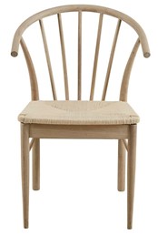 Krzesło Cassandra z podłokietnikami to mebel, który idealnie pasuje do wnętrz w stylu bohemy czy skandynawskim. Posiada wygodne i ergonomiczne podłokietniki oraz szerokie siedzisko. Wykonany jest z papieru plecionego, który nie tylko wygląda ciekawie i estetycznie, ale jest również bardzo wytrzymały. Reszta krzesła wykonana jest z bielonego dębu. Noga krzesła składa się z czterech nóg, przednie nogi zwężają się ku dołowi. Tył, nieco szerszy, płynnie przechodzi w oparcie. Oferuje pełne podparcie pleców i składa się z siedmiu pionowych elementów ułożonych w kształcie wachlarza.