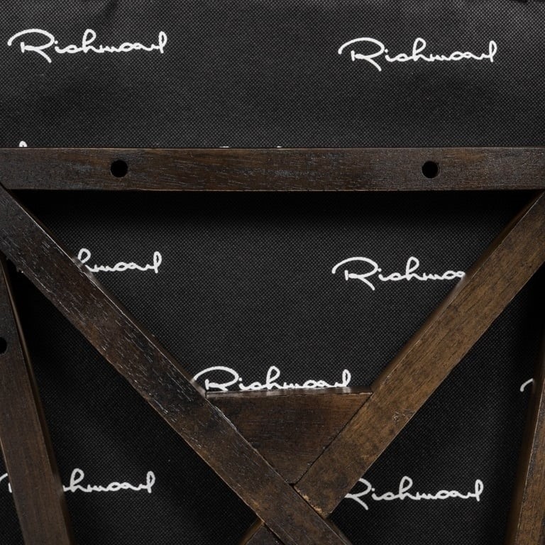 - Harmonijnie kontrastujące beżowe obicie i ciemne drewno