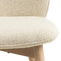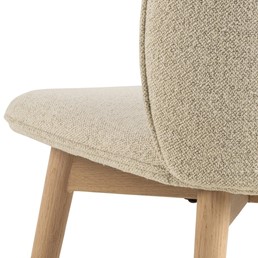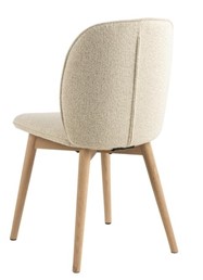 Krzesło Cindy to połączenie elegancji i funkcjonalności, idealne do jadalni lub salonu. Zaokrąglone oparcie zapewnia wygodę podczas posiłków, a tapicerka z miękkiej tkaniny bouclé wprowadza nowoczesny charakter. Drewniane nogi z kauczuku, olejowane i bielone, nadają meblowi lekkości w stylu skandynawskim.