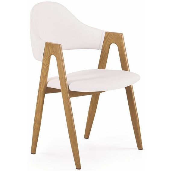 Podstawa przedstawionego krzesła wykonana została ze stali malowanej w kolorze dębu miodowego, natomiast jego siedzisko stanowi biała ecoskóra. Każde z oferowanych w Meble&Tkaniny krzeseł stworzono z maksymalną precyzją, a ich wygląd odpowiada najnowocześniejszym w tej branży trendom. Użyte materiały cechują się nieprzeciętną wytrzymałością i trwałością, dzięki czemu krzesła te są meblami, które potrafią służyć przez naprawdę wiele lat.