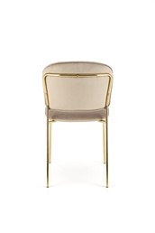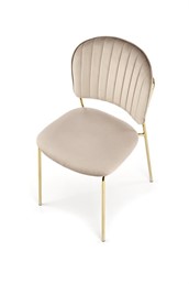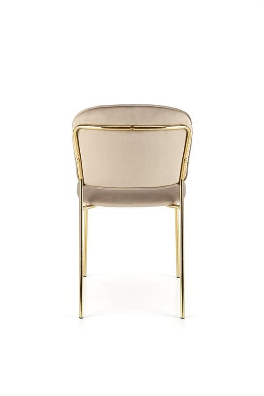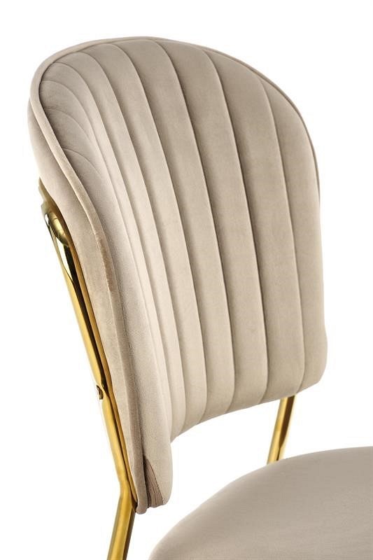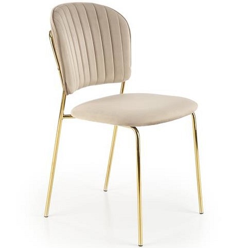 Krzesło K499 VELVET to mebel, który wyróżnia się minimalistycznym designem. Lekko wyprofilowane oparcie zdobią pionowe przeszycia, które dodają mu elegancji i finezji. Ponadczasowa beżowa aksamitna tkanina nadaje krzesłu eleganckiego wyglądu, a lekki połysk materiału w promieniach słońca wprowadza do pomieszczenia luksus. Tkanina ta jest bardzo wytrzymała, odporna na ścieranie i zarysowania, co zapewnia długą żywotność i piękny wygląd mebla. Ponadto łatwość czyszczenia jest ważna w przypadku mebli przeznaczonych do codziennego użytku. Krzesło posiada stabilną podstawę wykonaną ze stali chromowanej w kolorze złotym, co podkreśla jego elegancki charakter.