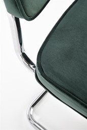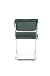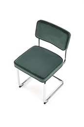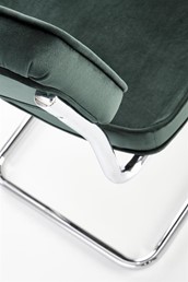 Krzesło K510 VELVET to elegancki mebel, który z pewnością przyciągnie uwagę swoim minimalistycznym designem. Oparcie i siedzisko pokryte miękką aksamitną tkaniną w umiarkowanym odcieniu zieleni. Aksamitna tkanina charakteryzuje się wyjątkową miękkością i delikatnym połyskiem, co szczególnie w słońcu podkreśla elegancki charakter krzesła. Dodatkowo aksamit jest materiałem łatwym w utrzymaniu czystości, co czyni krzesło praktycznym wyborem. Podstawa krzesła wykonana jest ze stali chromowanej, co zapewnia trwałość i stabilność. Srebrna przesuwana noga u dołu krzesła dodaje krzesłu eleganckiego wyglądu, ale także pozwala na delikatne bujanie, co zdecydowanie wpływa na wygodę użytkowania mebla. Krzesło K510 VELVET dzięki swoim walorom funkcjonalnym i estetycznym jest idealnym wyborem do salonu, gabinetu czy jadalni, dodając elegancji i komfortu.