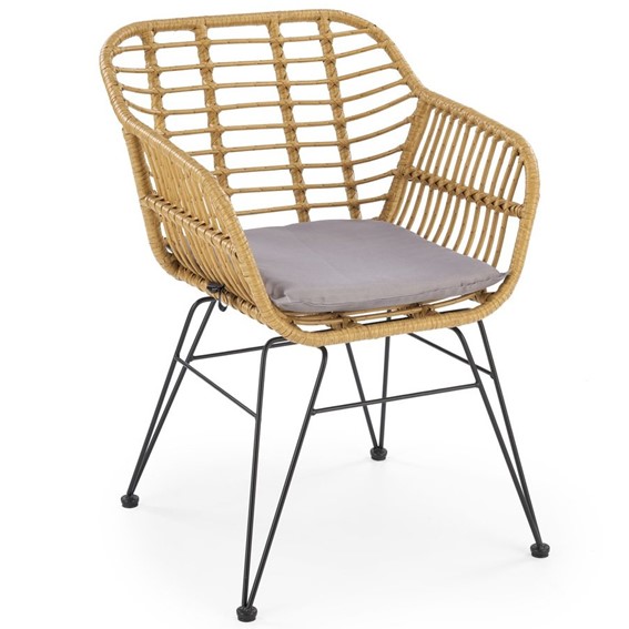Krzesło o wyjątkowym designie, stworzone z myślą o połączeniu funkcjonalności i estetyki. Jego solidny stelaż wykonany z metalu w czarnym kolorze nadaje mu nie tylko nowoczesny wygląd, ale również gwarantuje trwałość i stabilność. Korpus krzesła wykonany jest z eleganckiej plecionki rattanu, która dodaje mu przyjemnej tekstury i naturalnego uroku. Rattan, zastosowany w tym projekcie, nie tylko jest trwały, ale także nadaje meblowi lekkości i przytulności. Aby zapewnić komfort użytkowania, krzesło wyposażone jest w popielatą poduszkę, która nie tylko doskonale współgra z kolorystyką rattanu, ale także dodaje miękkości i przytulności.