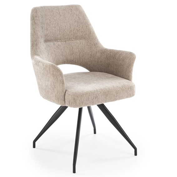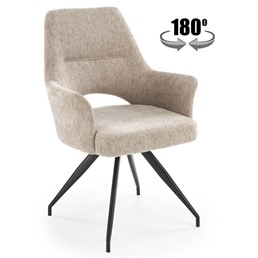 Nowoczesne krzesło obrotowe, które łączy funkcjonalność z designerskim podejściem do wyglądu. Jego solidny stelaż wykonany ze stali w eleganckim, głębokim czarnym kolorze nie tylko zapewnia stabilność, ale również dodaje meblowi nowoczesności i industrialnego charakteru. Siedzisko i oparcie krzesła obite są wysokiej jakości tkaniną w delikatnym beżowym odcieniu. Ta neutralna kolorystyka sprawia, że krzesło łatwo komponuje się z różnymi stylami wnętrz, jednocześnie wprowadzając do przestrzeni subtelność i elegancję. Dodatkowym atutem tego krzesła jest jego zdolność do obracania, co dodaje mu wszechstronności i sprawia, że jest idealnym wyborem do różnych przestrzeni, takich jak biuro, gabinet czy pokój dzienny. Obracający mechanizm umożliwia łatwe dostosowanie pozycji siedzenia bez konieczności przemieszczania całego krzesła.