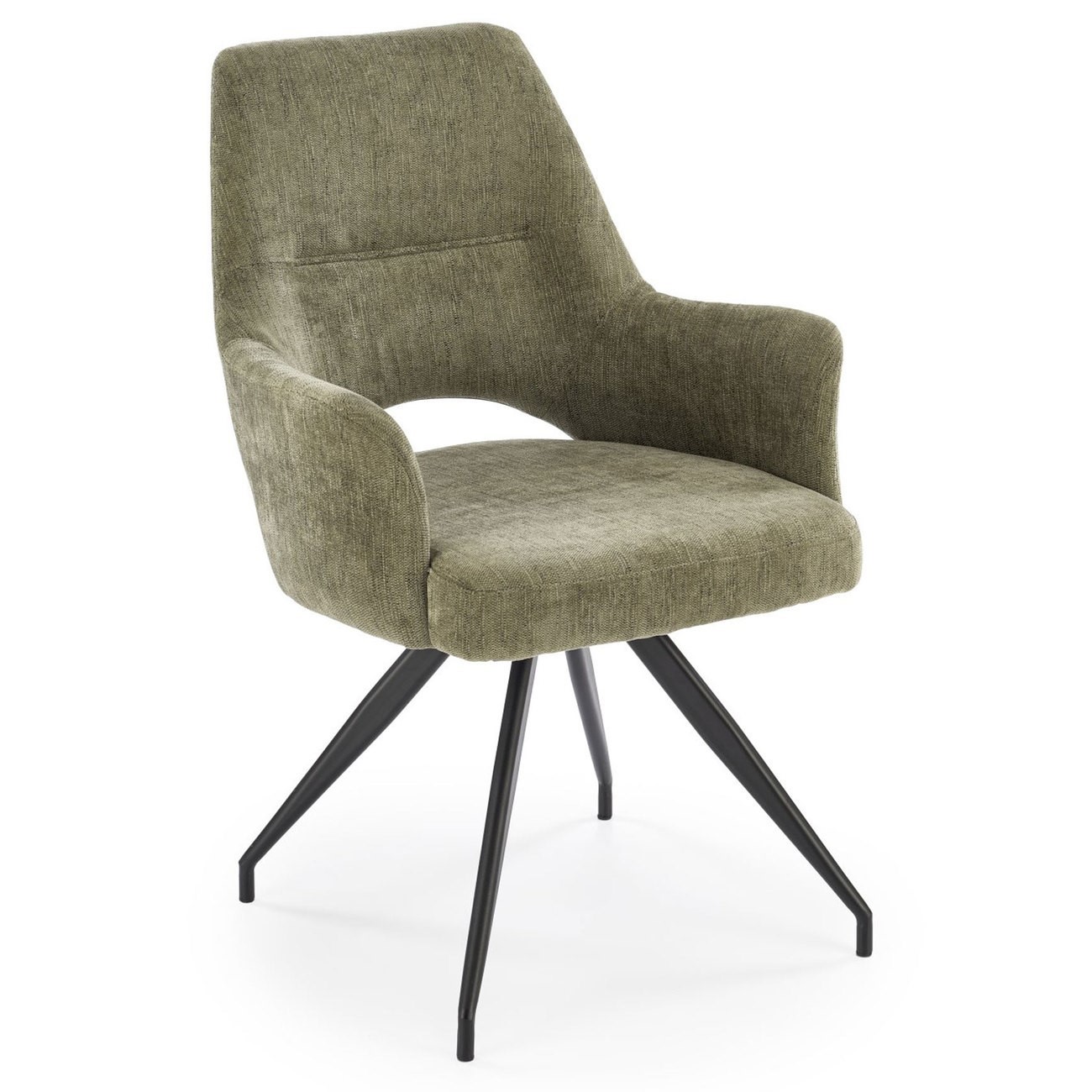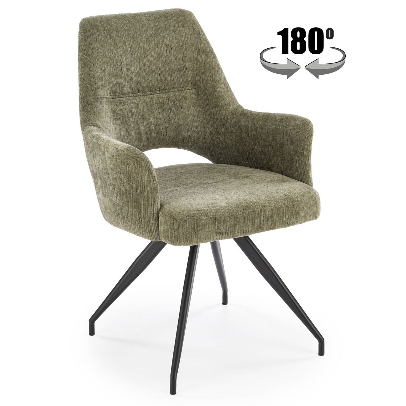 Nowoczesne krzesło obrotowe, które łączy funkcjonalność z designerskim podejściem do wyglądu. Jego solidny stelaż wykonany ze stali w eleganckim, głębokim czarnym kolorze nie tylko zapewnia stabilność, ale również dodaje meblowi nowoczesności i industrialnego charakteru. Siedzisko i oparcie krzesła obite są wysokiej jakości tkaniną w delikatnym oliwkowym odcieniu. Ta kolorystyka sprawia, że krzesło łatwo komponuje się z różnymi stylami wnętrz, jednocześnie wprowadzając do przestrzeni subtelność i elegancję. Dodatkowym atutem tego krzesła jest jego zdolność do obracania, co dodaje mu wszechstronności i sprawia, że jest idealnym wyborem do różnych przestrzeni, takich jak biuro, gabinet czy pokój dzienny. Obracający mechanizm umożliwia łatwe dostosowanie pozycji siedzenia bez konieczności przemieszczania całego krzesła.