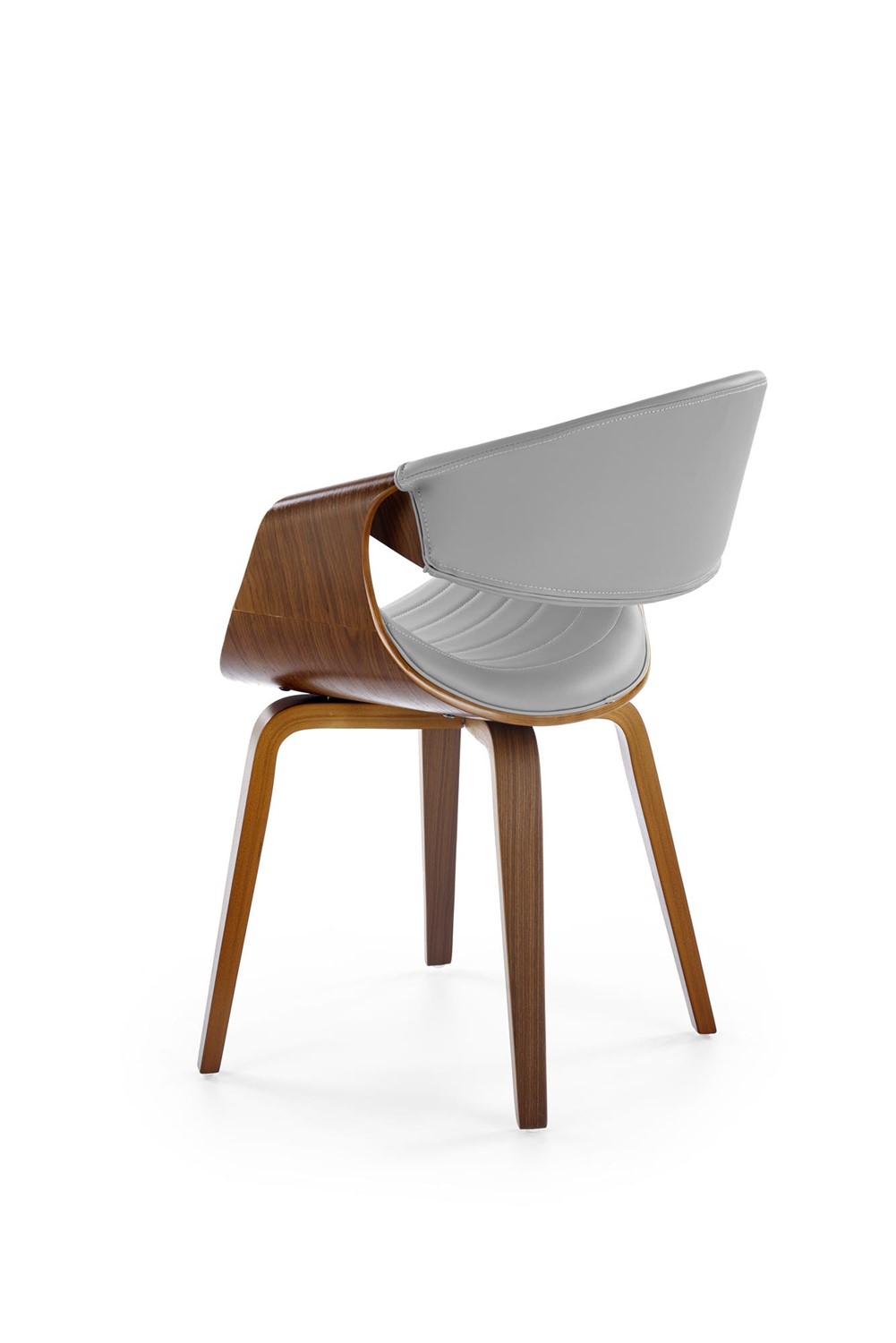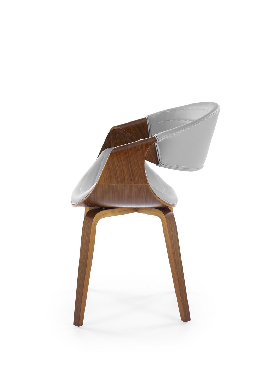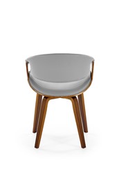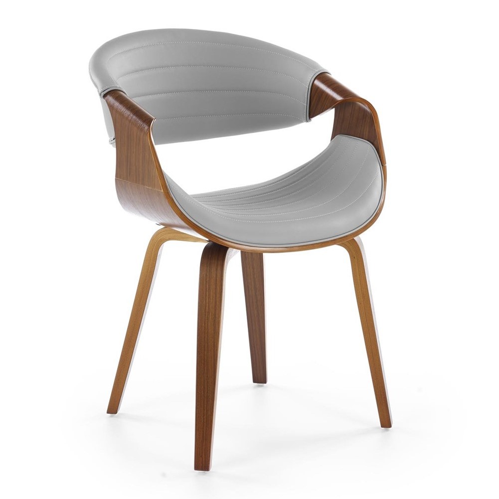 Eleganckie krzesło, które wyróżnia się nietuzinkowym designem i starannym wykonaniem. Jego stelaż został precyzyjnie wykonany z giętej sklejki, nadając mu lekkości, jednocześnie zachowując solidność. Orzechowy kolor stelaża dodaje meblowi ciepła i naturalnego uroku. Siedzisko i oparcie krzesła są obite wysokiej jakości szarą ekoskórą, co nadaje mu wyjątkowego charakteru i nowoczesnego wyglądu. Popielata ekoskóra nie tylko prezentuje się elegancko, ale również jest łatwa w utrzymaniu czystości, co sprawia, że krzesło jest praktyczne i łatwe do pielęgnacji.