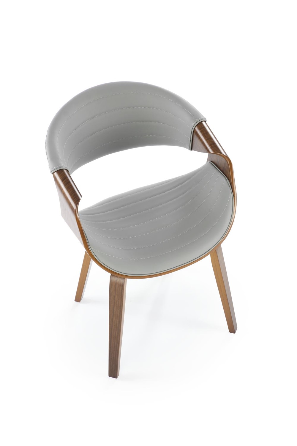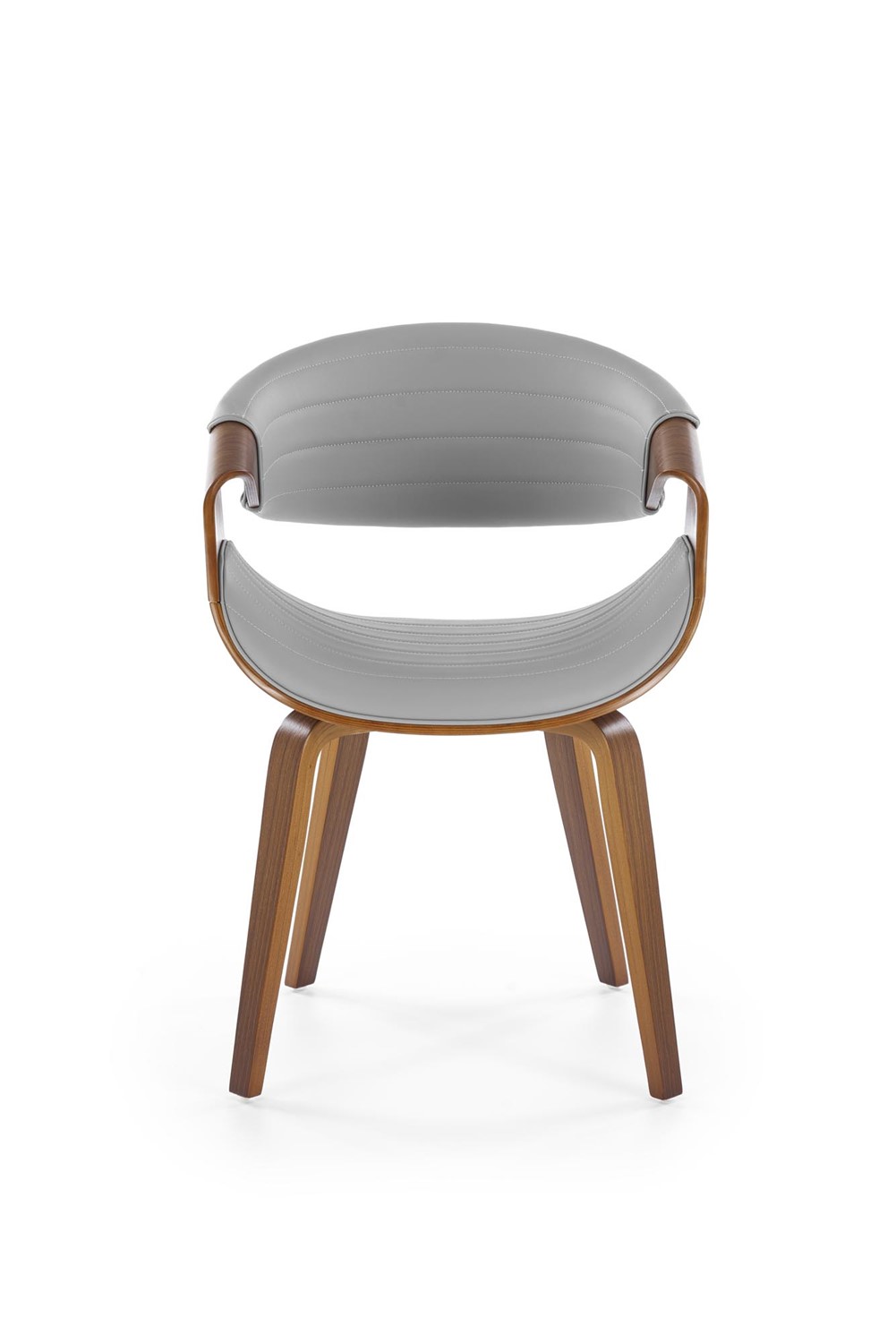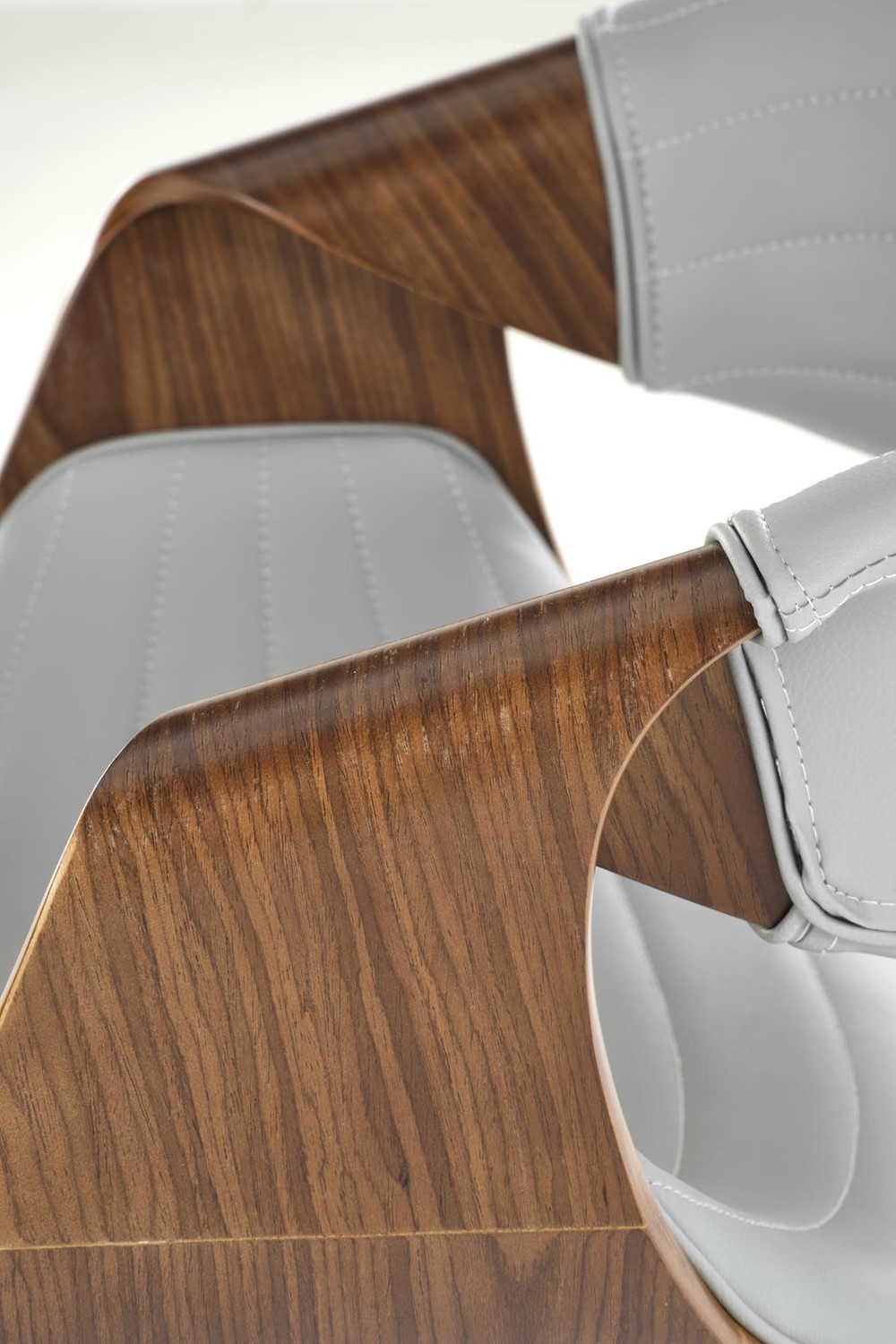 Eleganckie krzesło, które wyróżnia się nietuzinkowym designem i starannym wykonaniem. Jego stelaż został precyzyjnie wykonany z giętej sklejki, nadając mu lekkości, jednocześnie zachowując solidność. Orzechowy kolor stelaża dodaje meblowi ciepła i naturalnego uroku. Siedzisko i oparcie krzesła są obite wysokiej jakości szarą ekoskórą, co nadaje mu wyjątkowego charakteru i nowoczesnego wyglądu. Popielata ekoskóra nie tylko prezentuje się elegancko, ale również jest łatwa w utrzymaniu czystości, co sprawia, że krzesło jest praktyczne i łatwe do pielęgnacji.