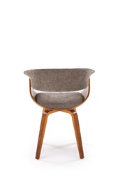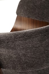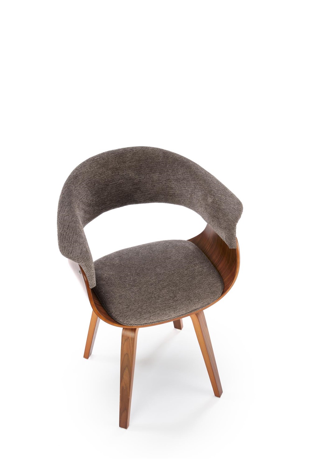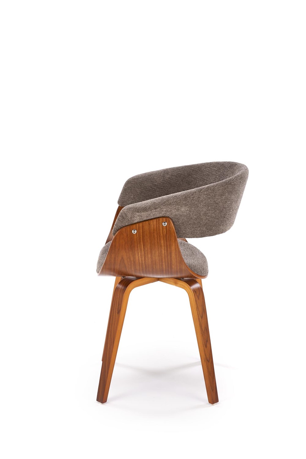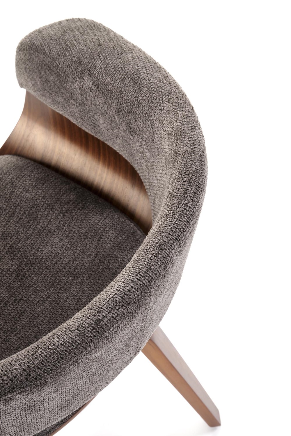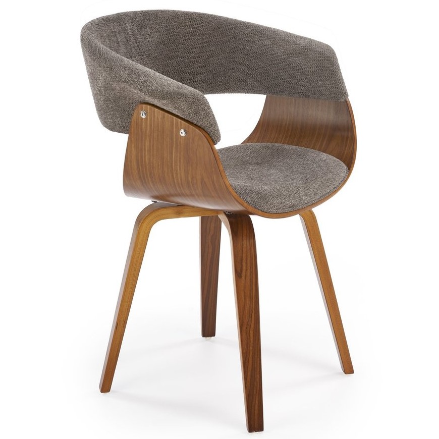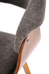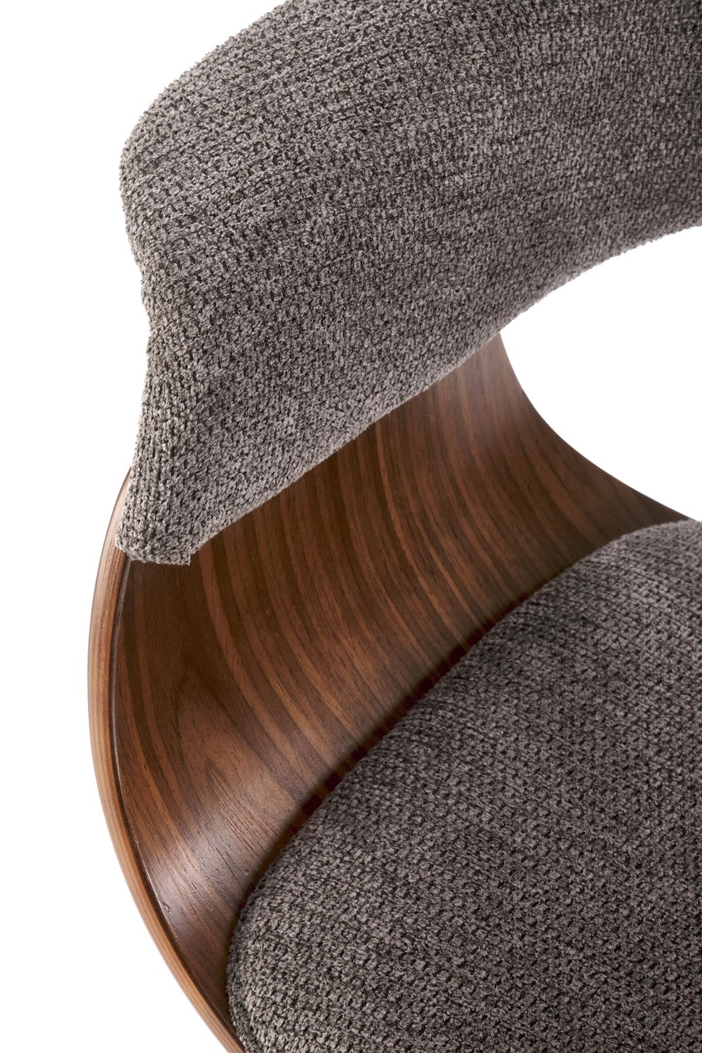 Eleganckie krzesło, które wyróżnia się nietuzinkowym designem i starannym wykonaniem. Jego stelaż został precyzyjnie wykonany z giętej sklejki, nadając mu lekkości, jednocześnie zachowując solidność. Orzechowy kolor stelaża dodaje meblowi ciepła i naturalnego uroku. Siedzisko i oparcie krzesła są obite wysokiej jakości popilatą tkaniną, co nadaje mu wyjątkowego charakteru i nowoczesnego wyglądu. Szara tkanina nie tylko prezentuje się elegancko, ale również jest łatwa w utrzymaniu czystości, co sprawia, że krzesło jest praktyczne i łatwe do pielęgnacji.